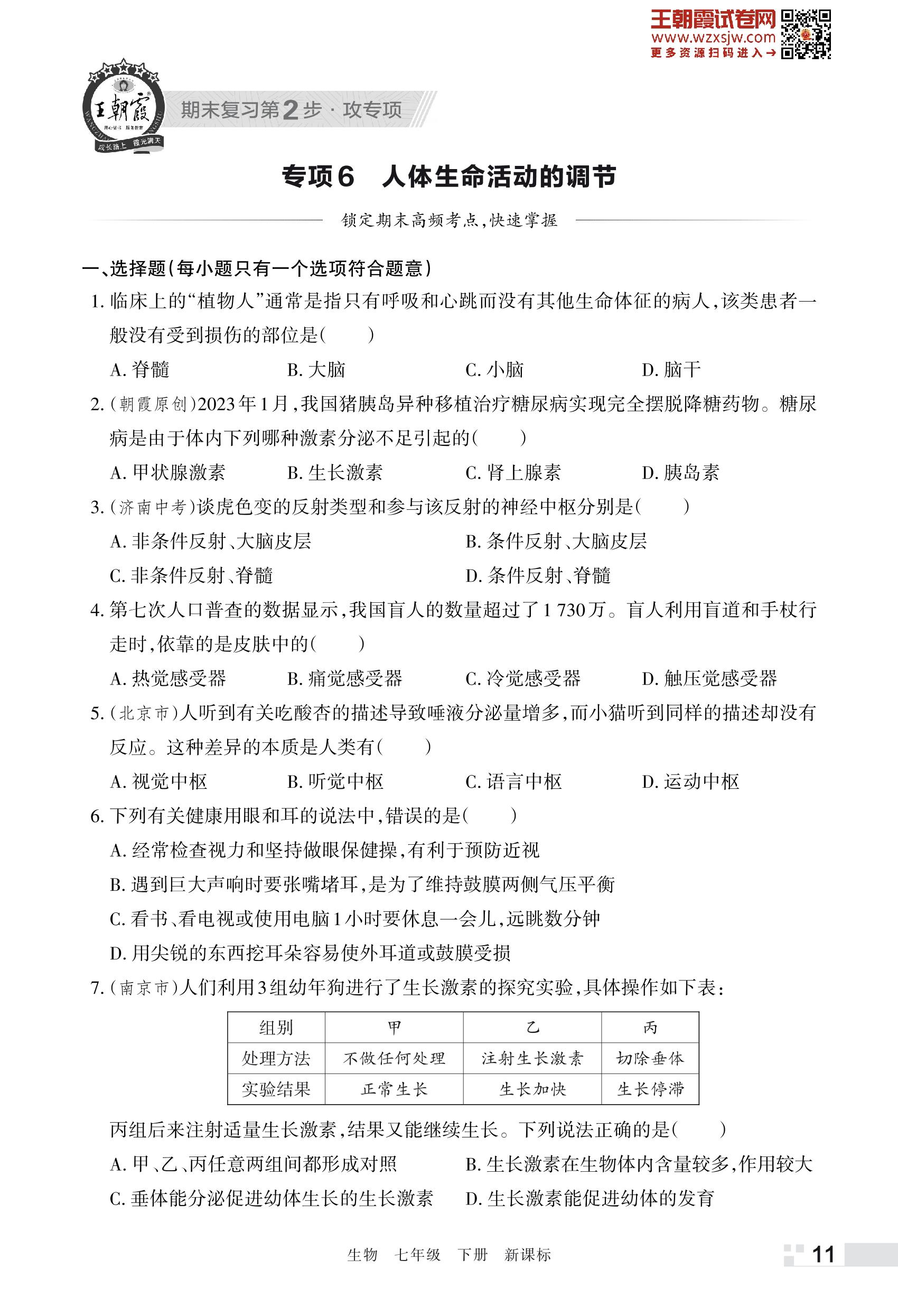 王朝霞期末专项卷——人体生命活动的调节七年级下册生物(新课标版)_R230428151956405【6】