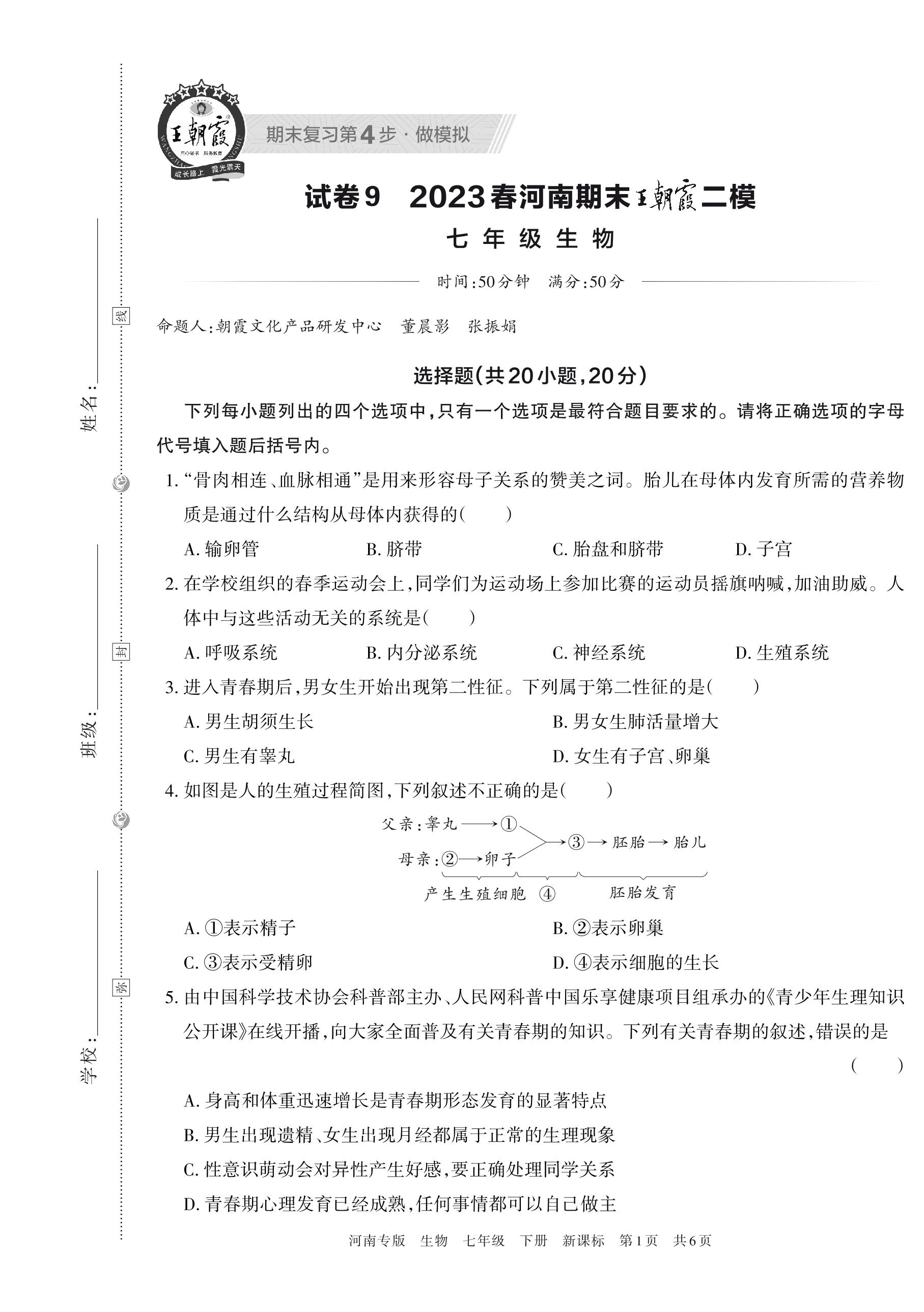 王朝霞期末模拟卷七年级下册生物(新课标版)【9】