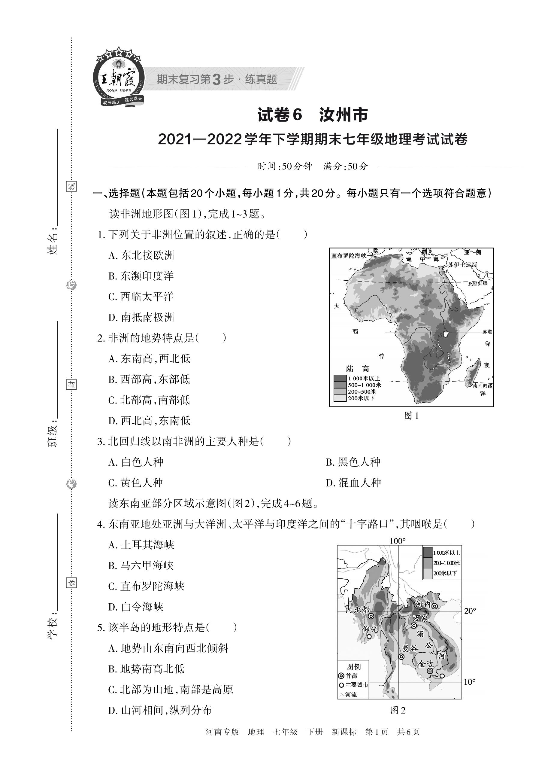 汝州市2021—2022学年下学期期末七年级地理考试试卷(新课标版)【6】