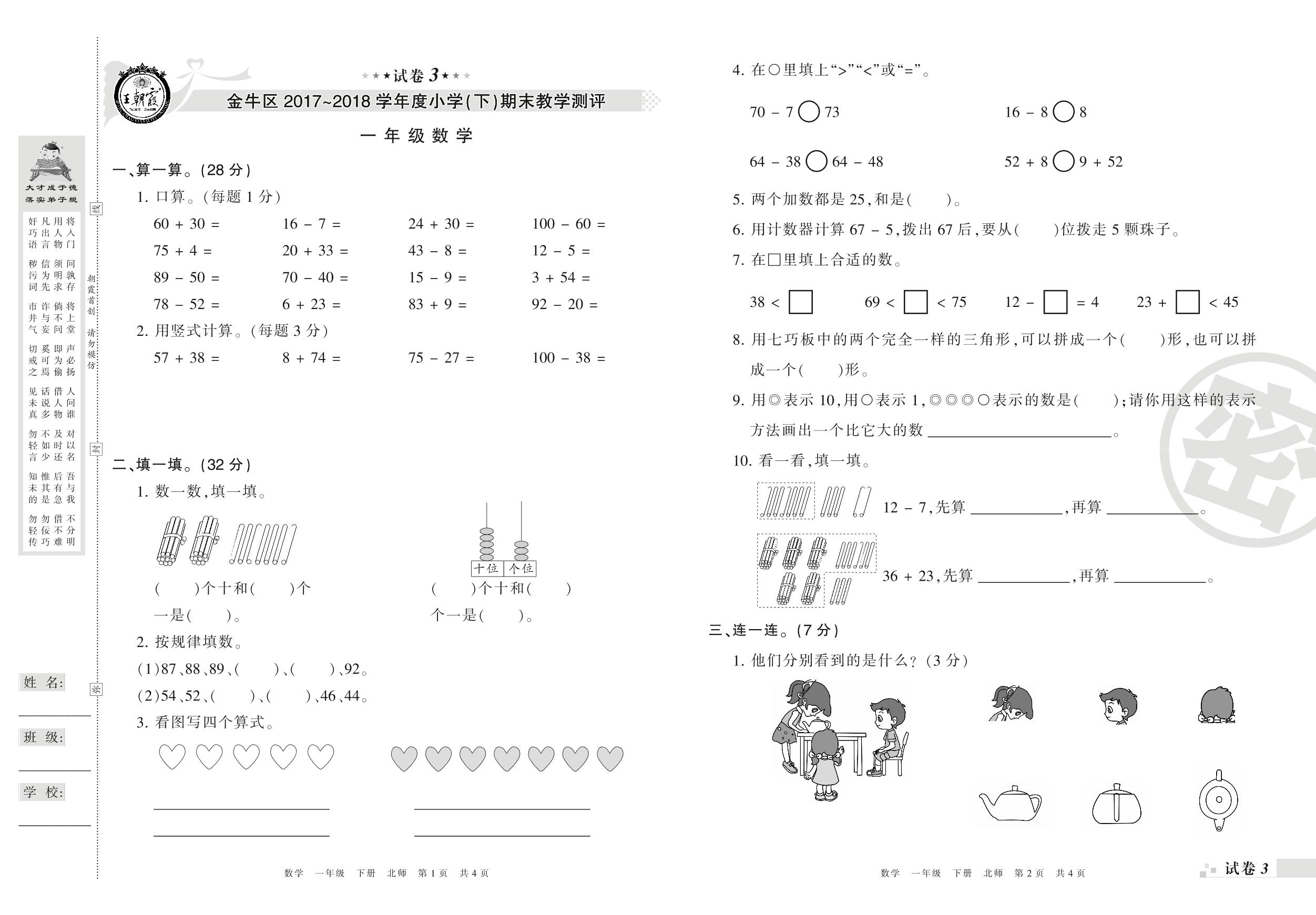 2017-2018学年第二学期成都市金牛区一年级数学试卷(北师版)【3】