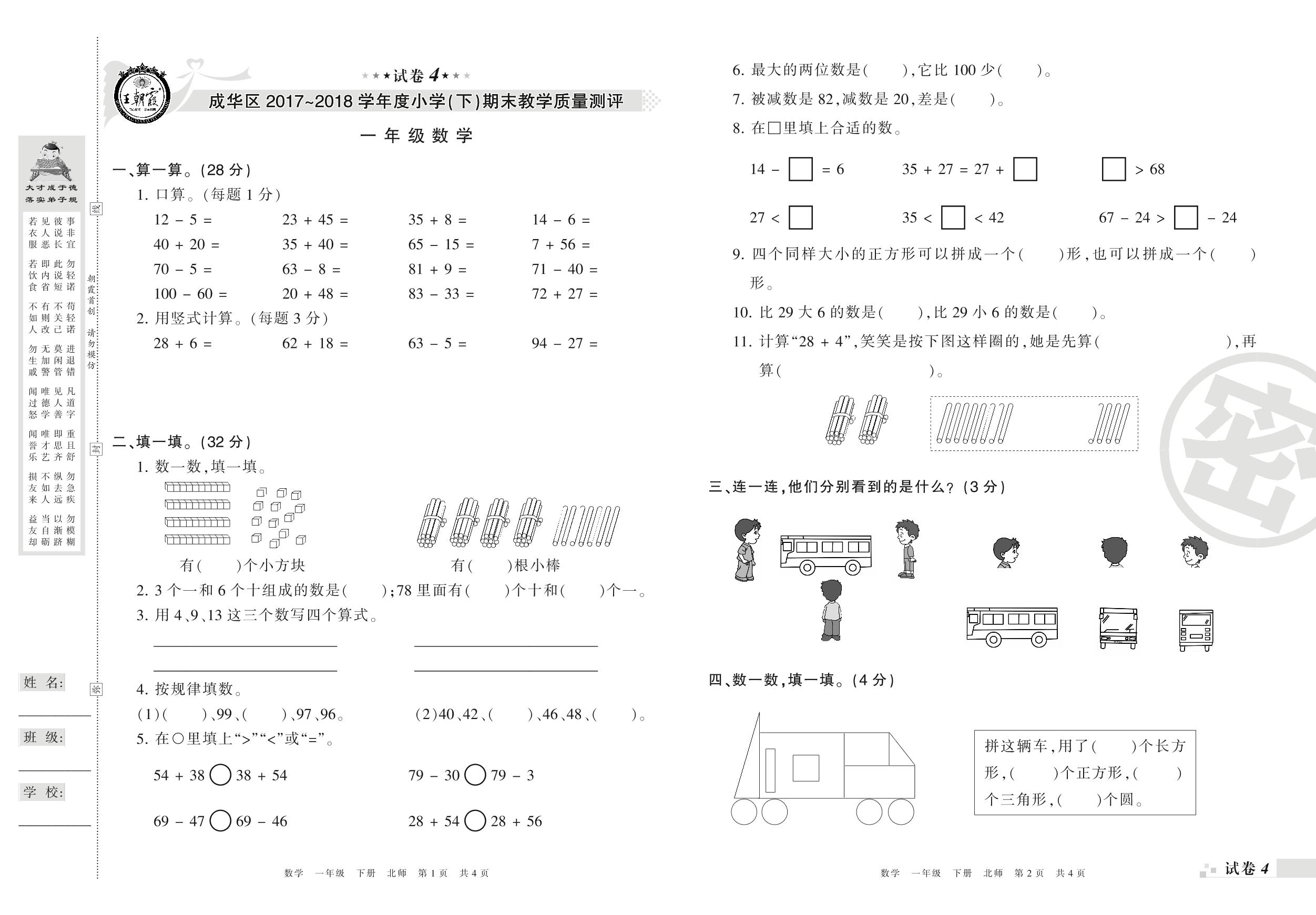 2017-2018学年第二学期成都市成华区一年级数学试卷(北师版)【4】