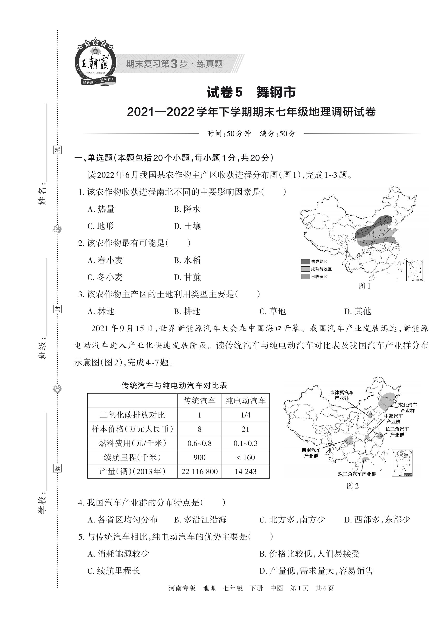 舞钢市2021—2022学年下学期期末七年级地理调研试卷(中图版)【5】