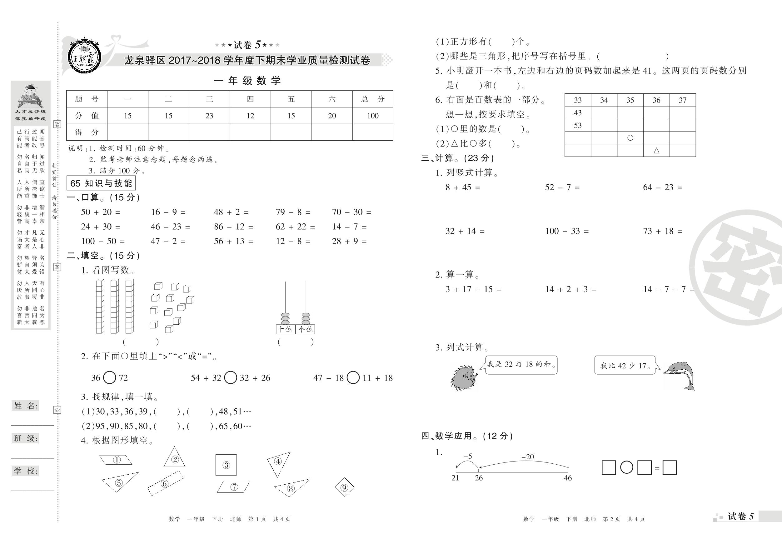2017-2018学年第二学期成都市龙泉驿区一年级数学试卷(北师版)【5】