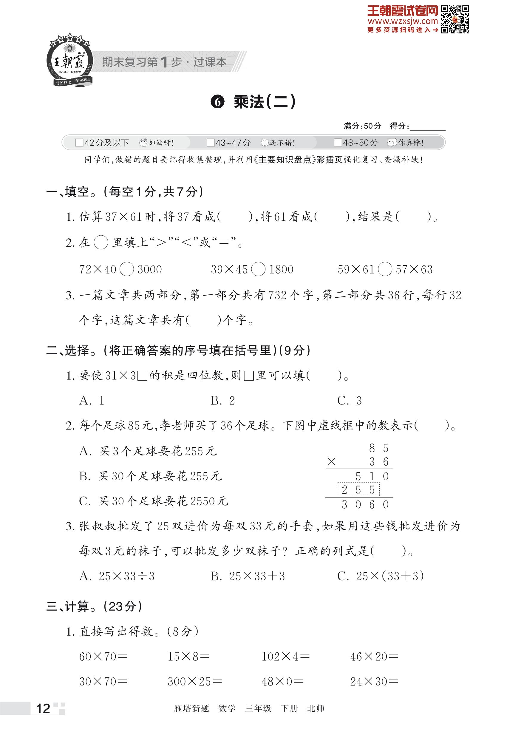 王朝霞期末过课本——6 乘法(二)三年级下册数学(北师版)_R230428160559687