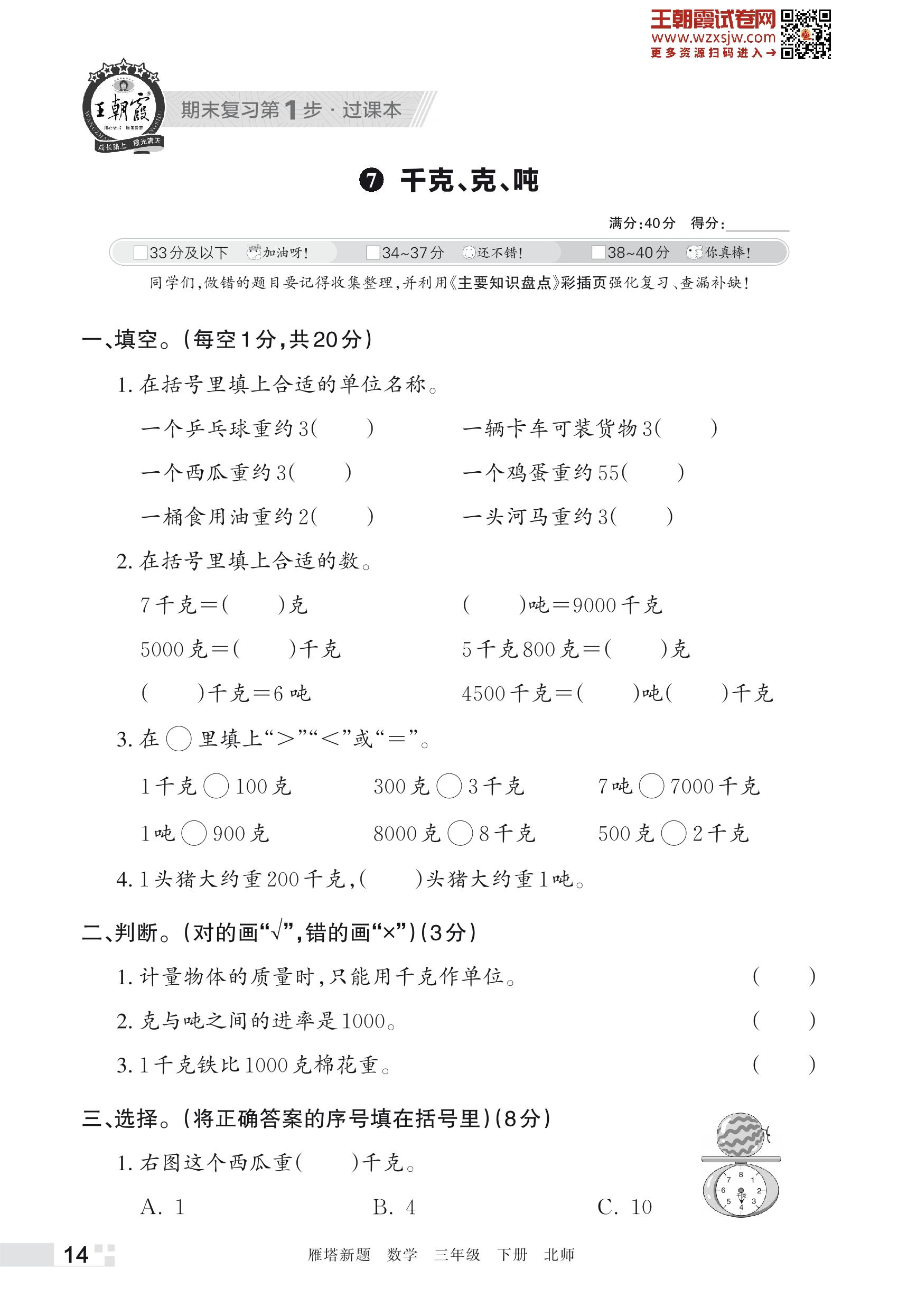 王朝霞期末过课本——7 千克、克、吨三年级下册数学(北师版)_R230428160559921