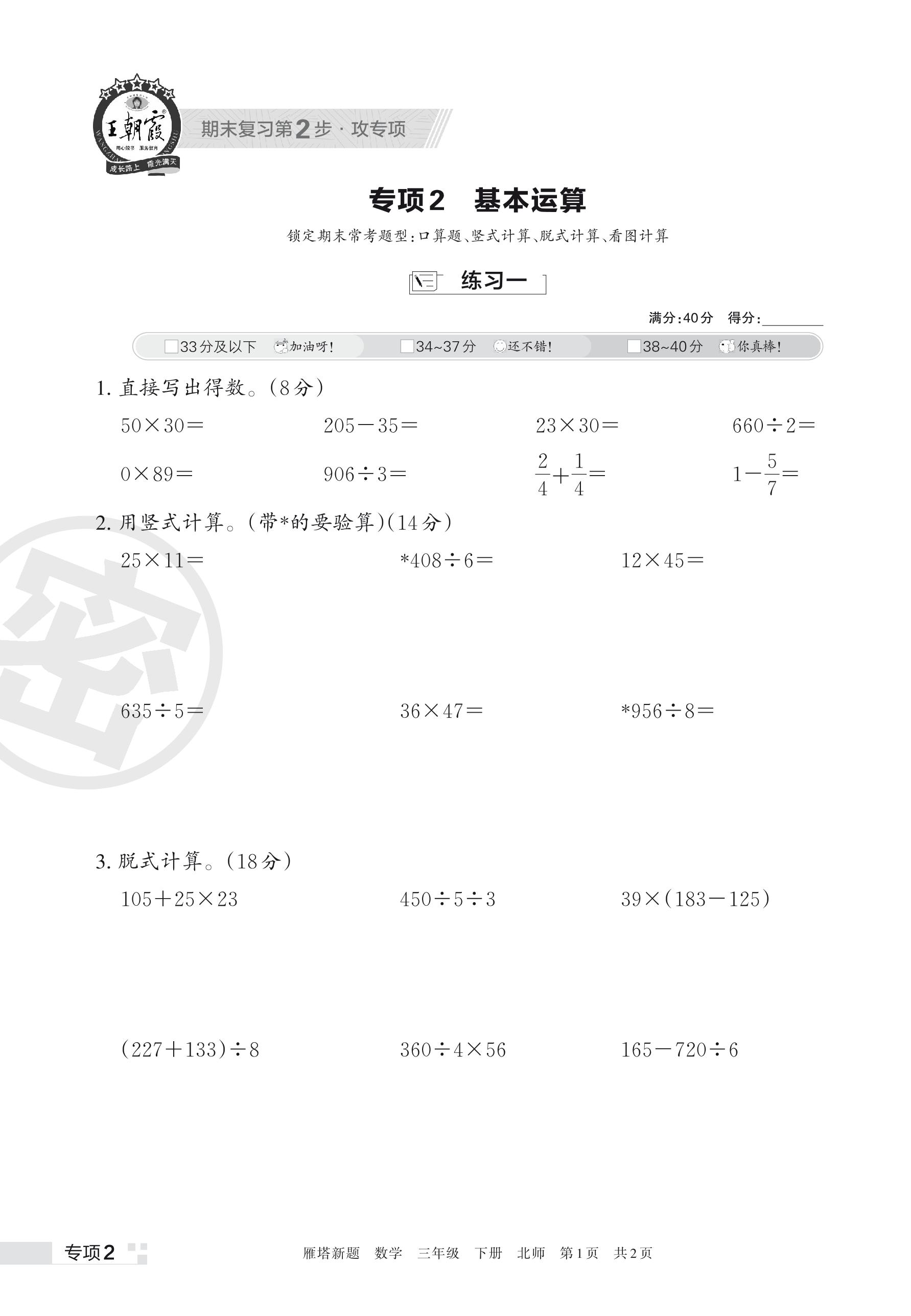 王朝霞期末专项卷——基本运算三年级下册数学(北师版)_R230428160600832【2】