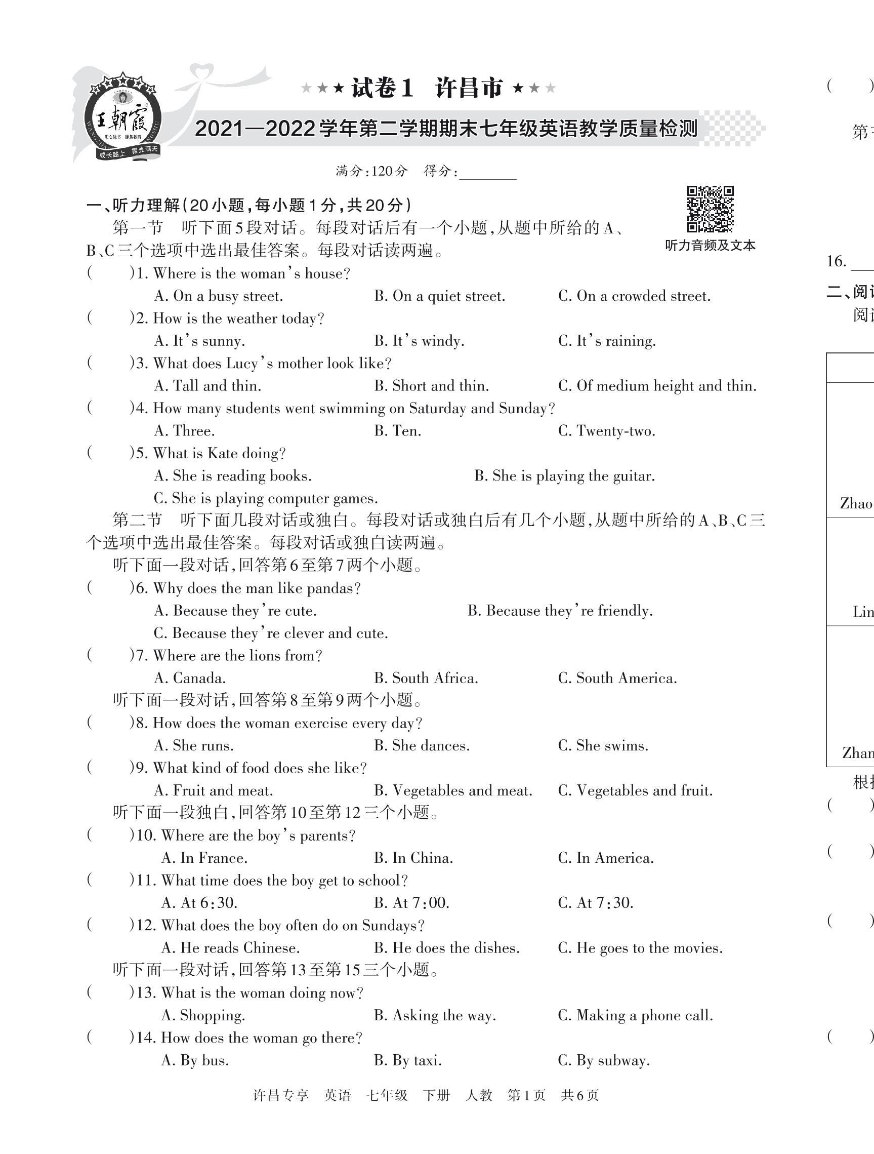 许昌市2021— 2022学年第二学期期末七年级英语教学质量检测(人教版)【1】