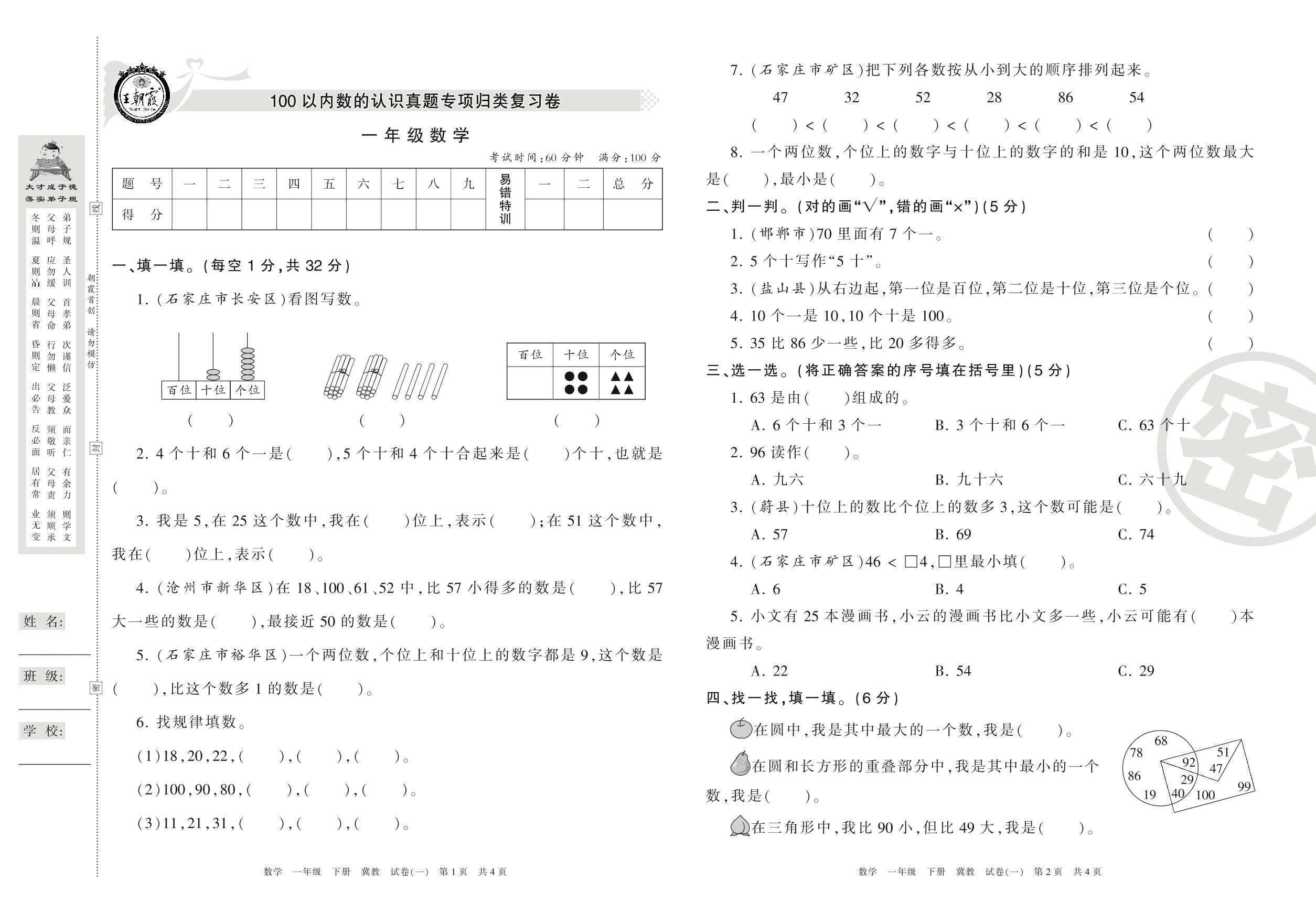 一年级数学冀教版下册专项卷