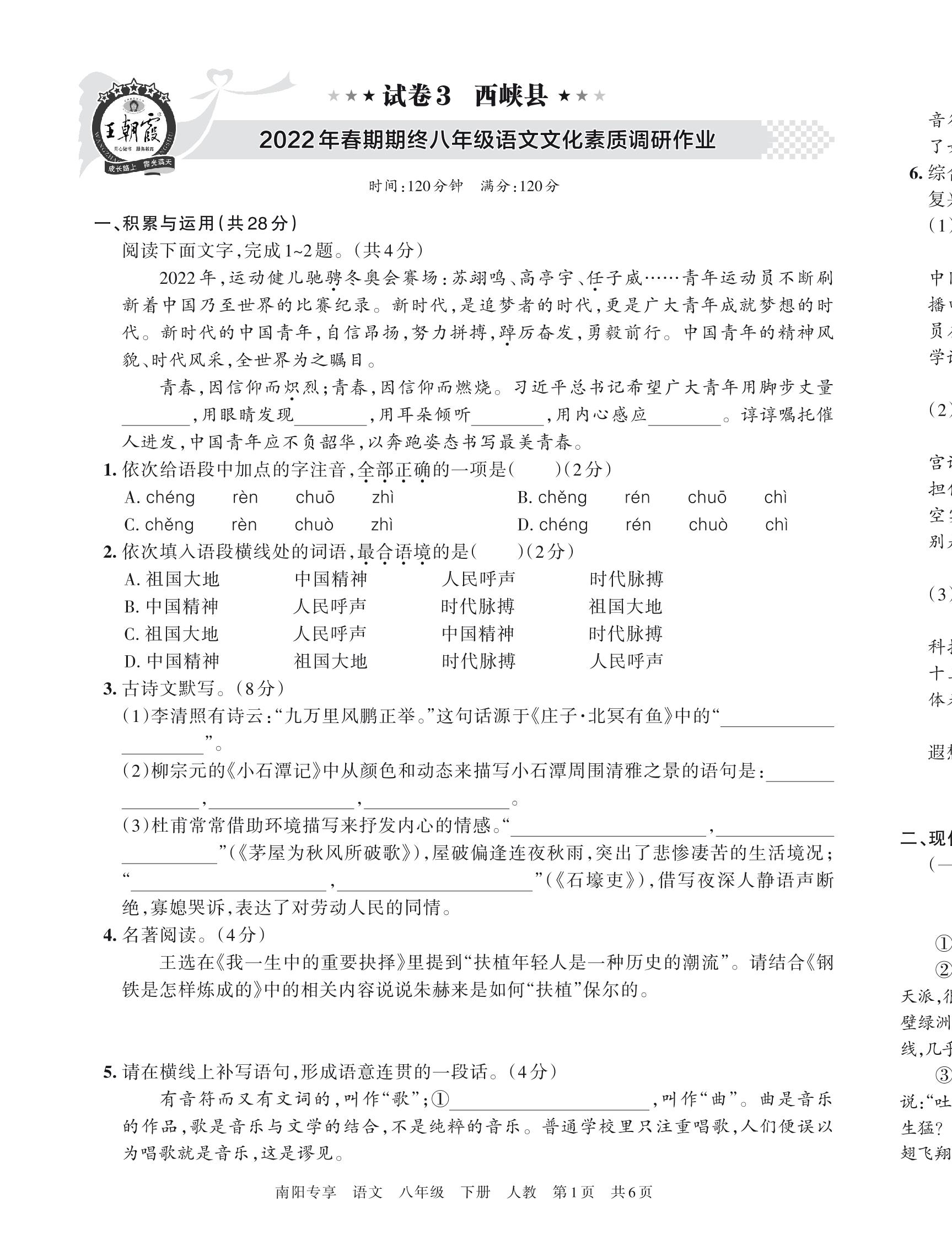 西峡县2022年春期期终八年级语文文化素质调研作业(人教版)【3】
