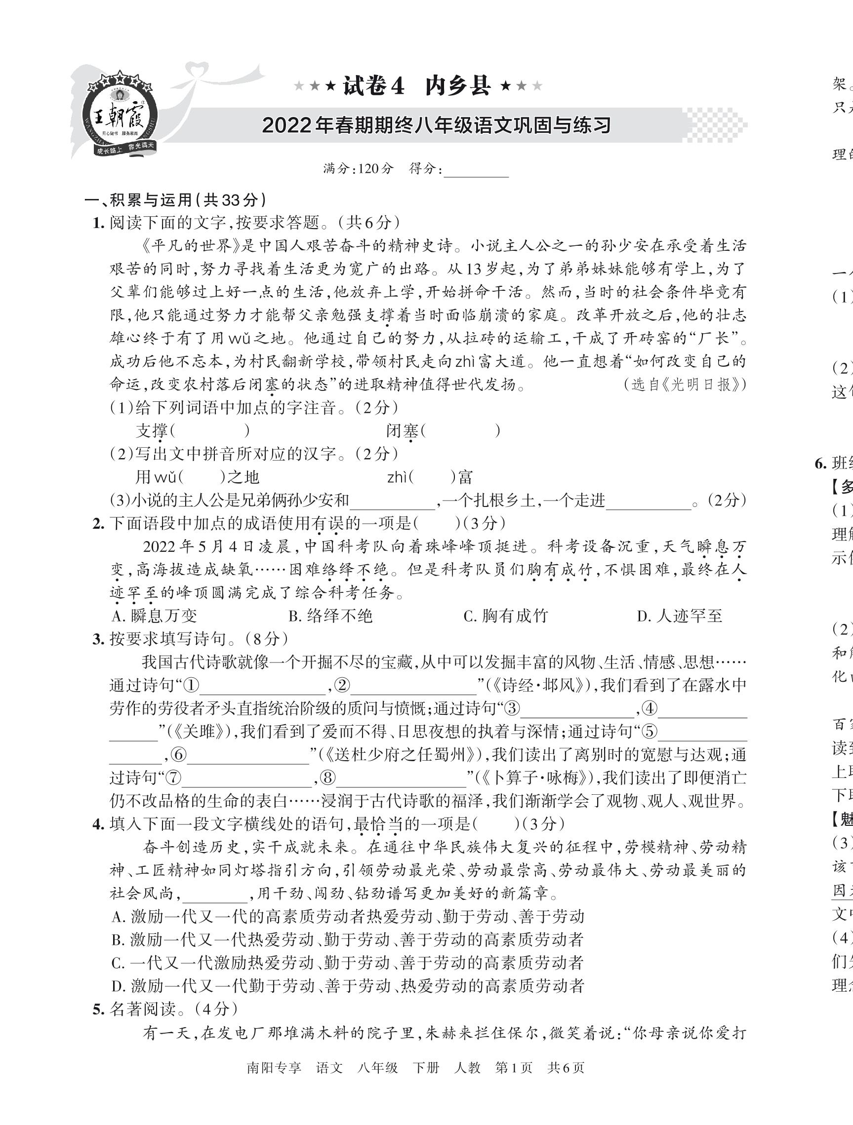 内乡县2022年春期期终八年级语文巩固与练习(人教版)【4】