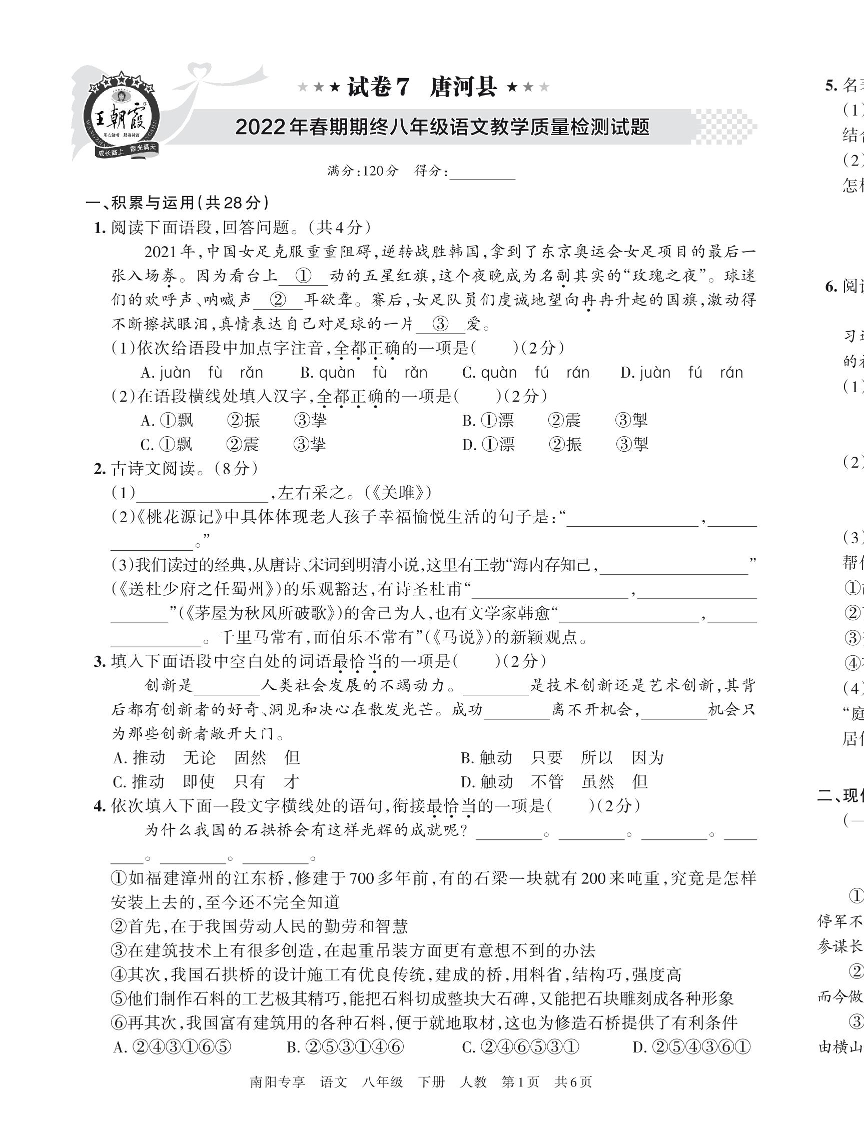 唐河县2022年春期期终八年级语文教学质量检测试题(人教版)【7】