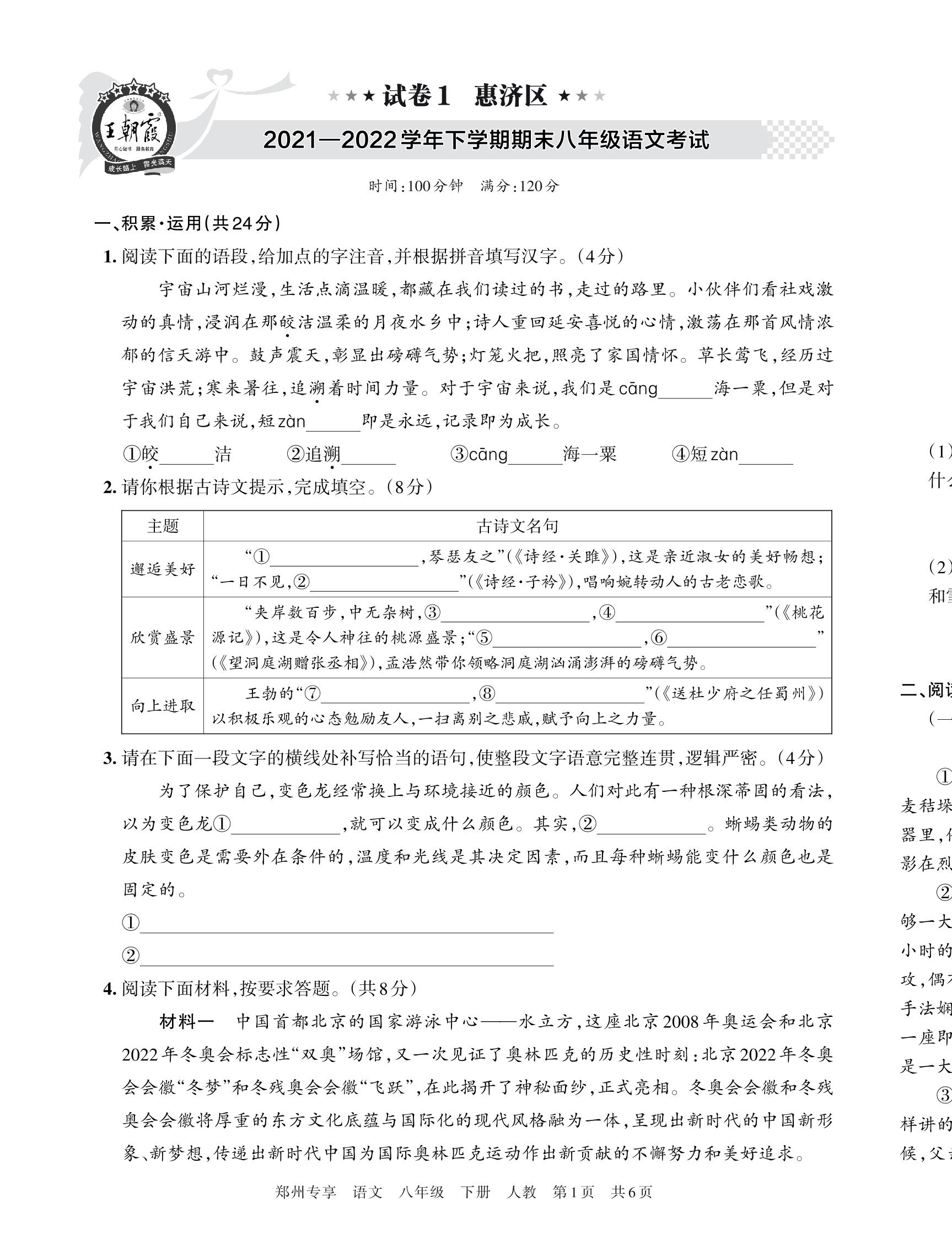 惠济区2021—2022学年下学期期末八年级语文考试【1】