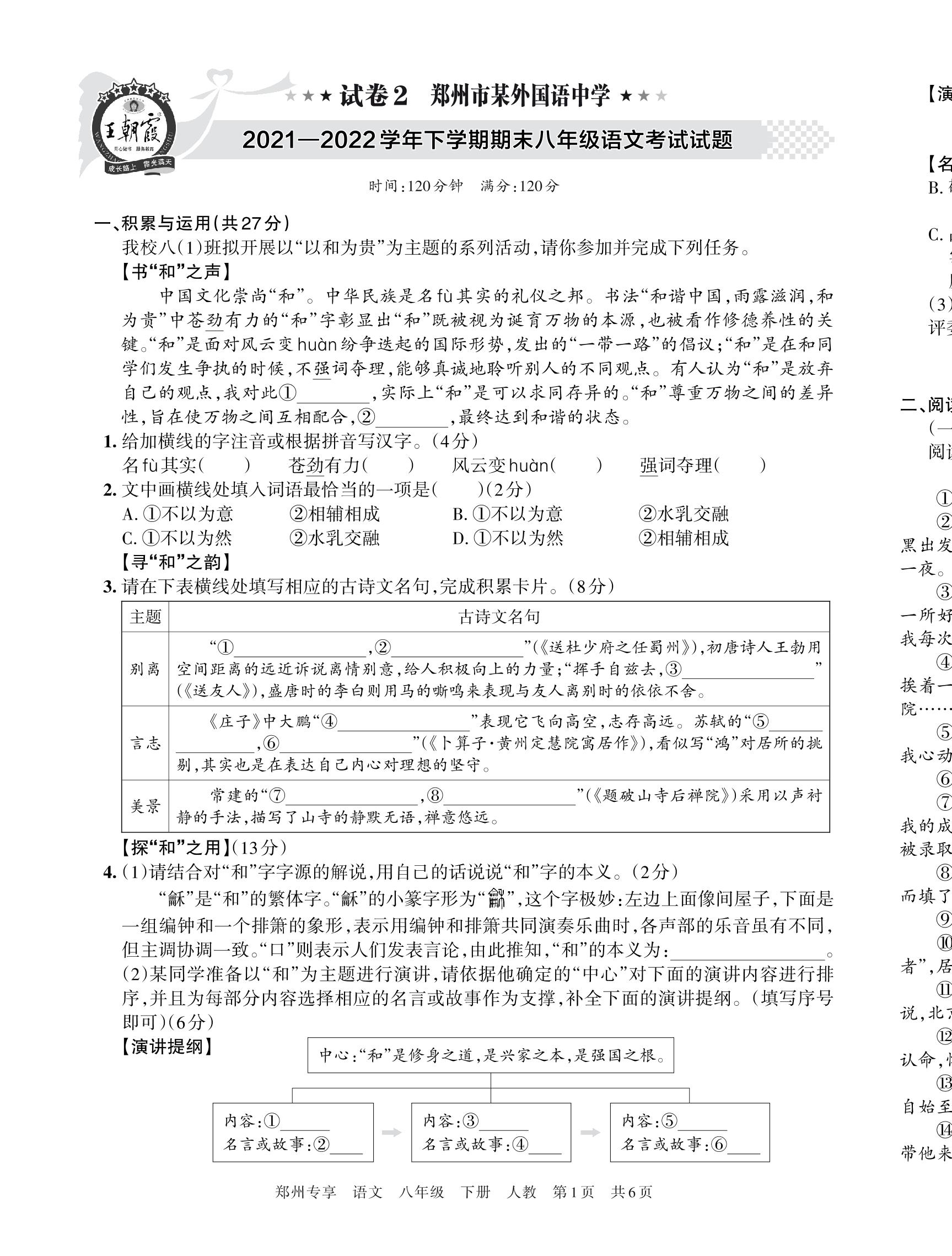 郑州市某外国语中学2021—2022学年下学期期末八年级语文考试试题【2】