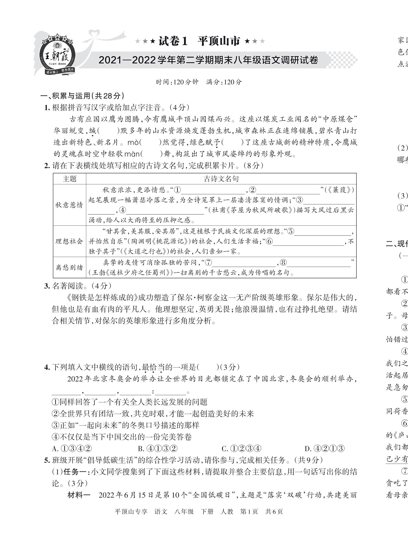 平顶山市2021—2022学年第二学期期末八年级语文调研试卷(人教版)【1】