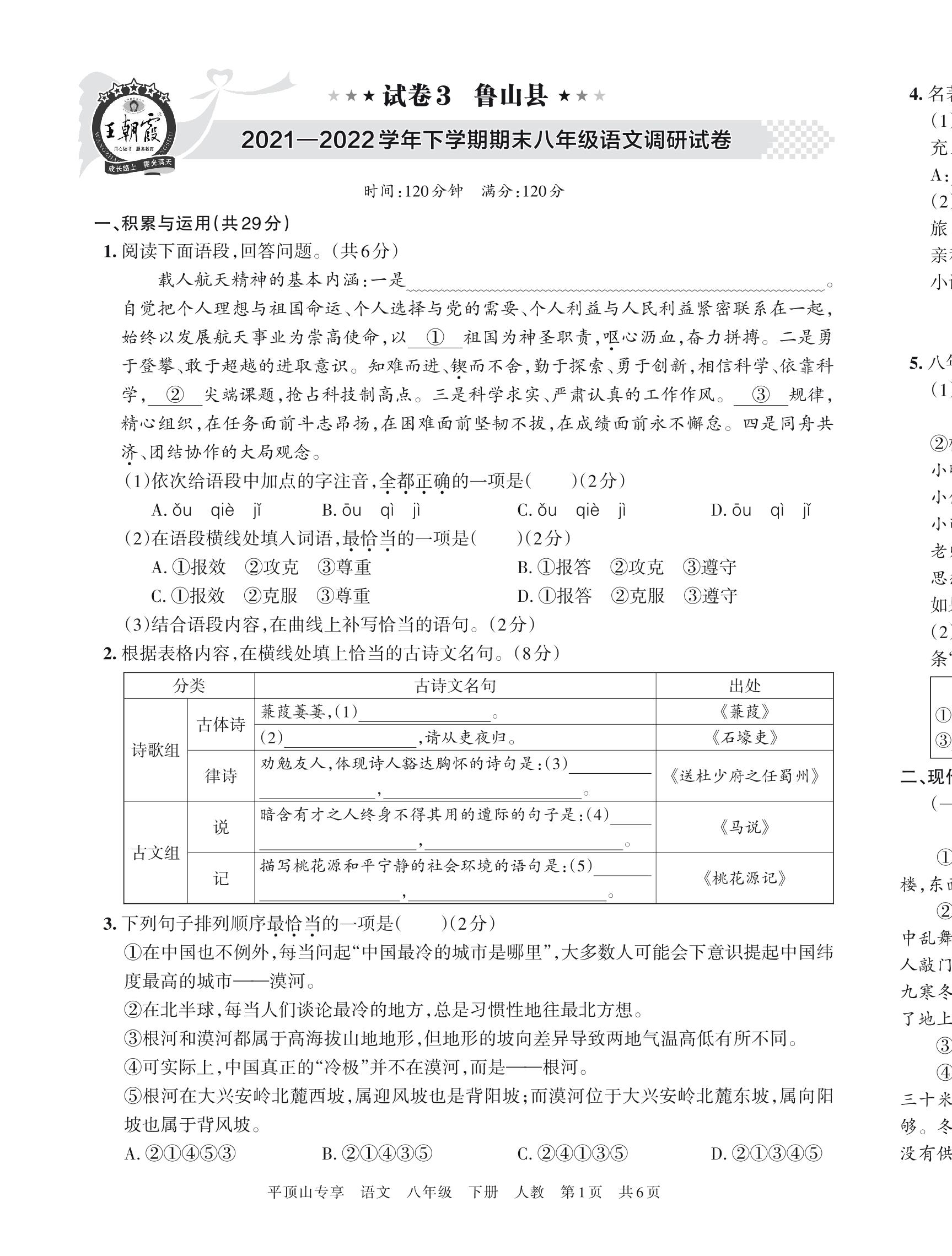 鲁山县2021—2022学年下学期期末八年级语文调研试卷(人教版)【3】