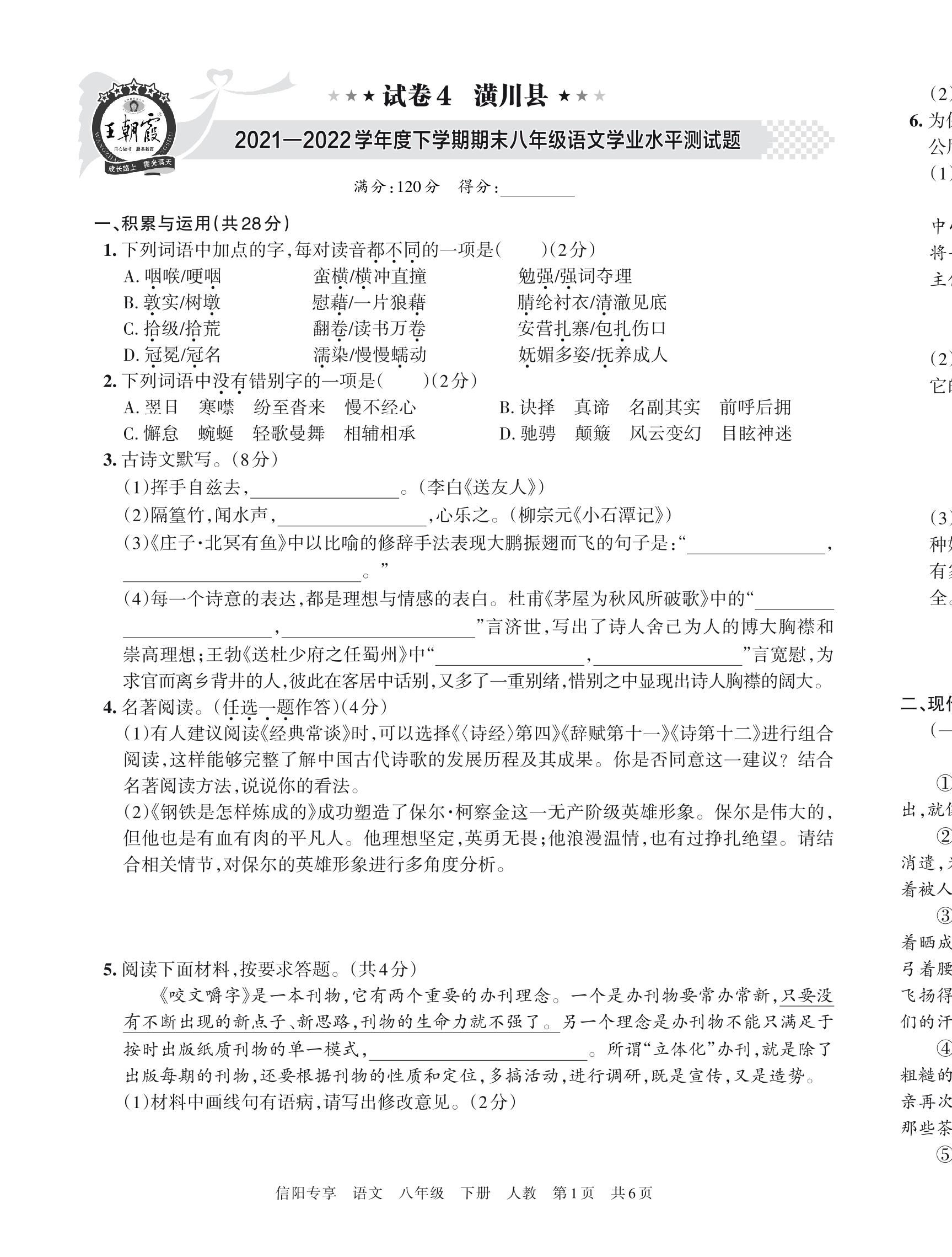 潢川县2021—2022学年度下学期期末八年级语文学业水平测试题(人教版)【4】