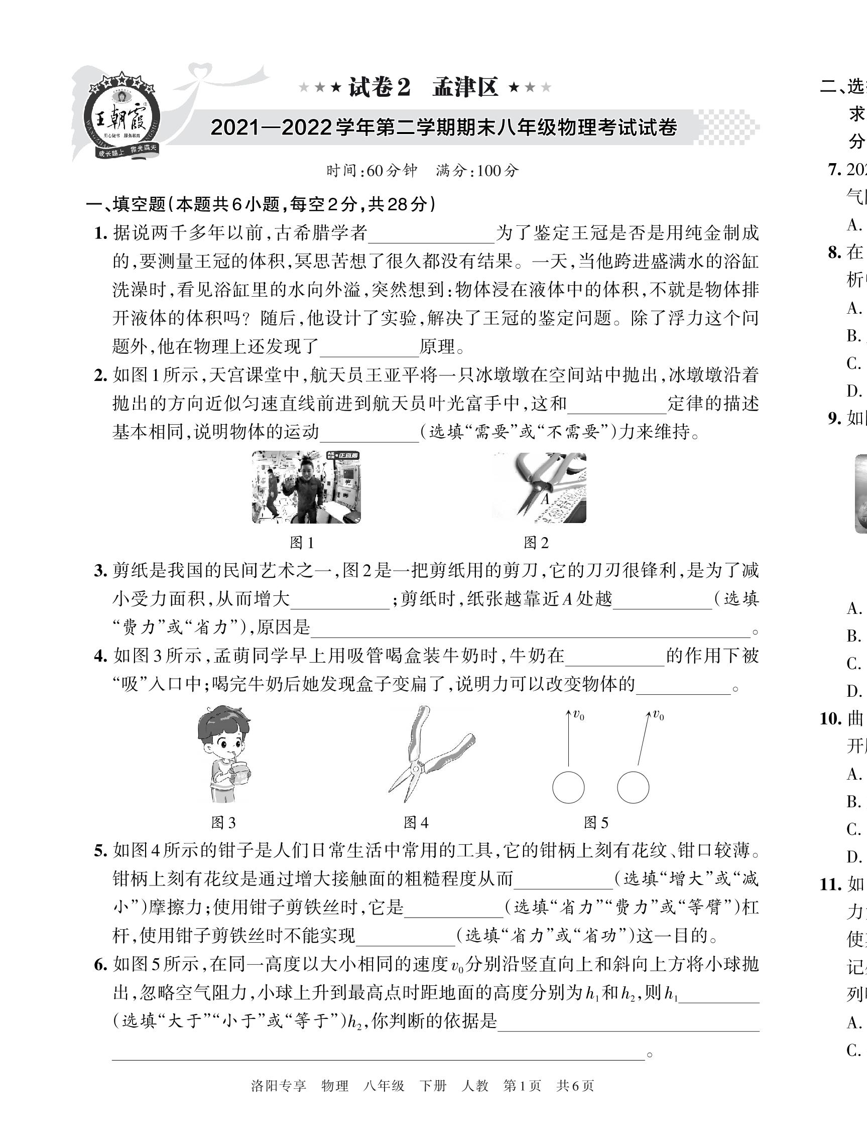 孟津区2021—2022学年第二学期期末八年级物理考试试卷(人教版)【2】