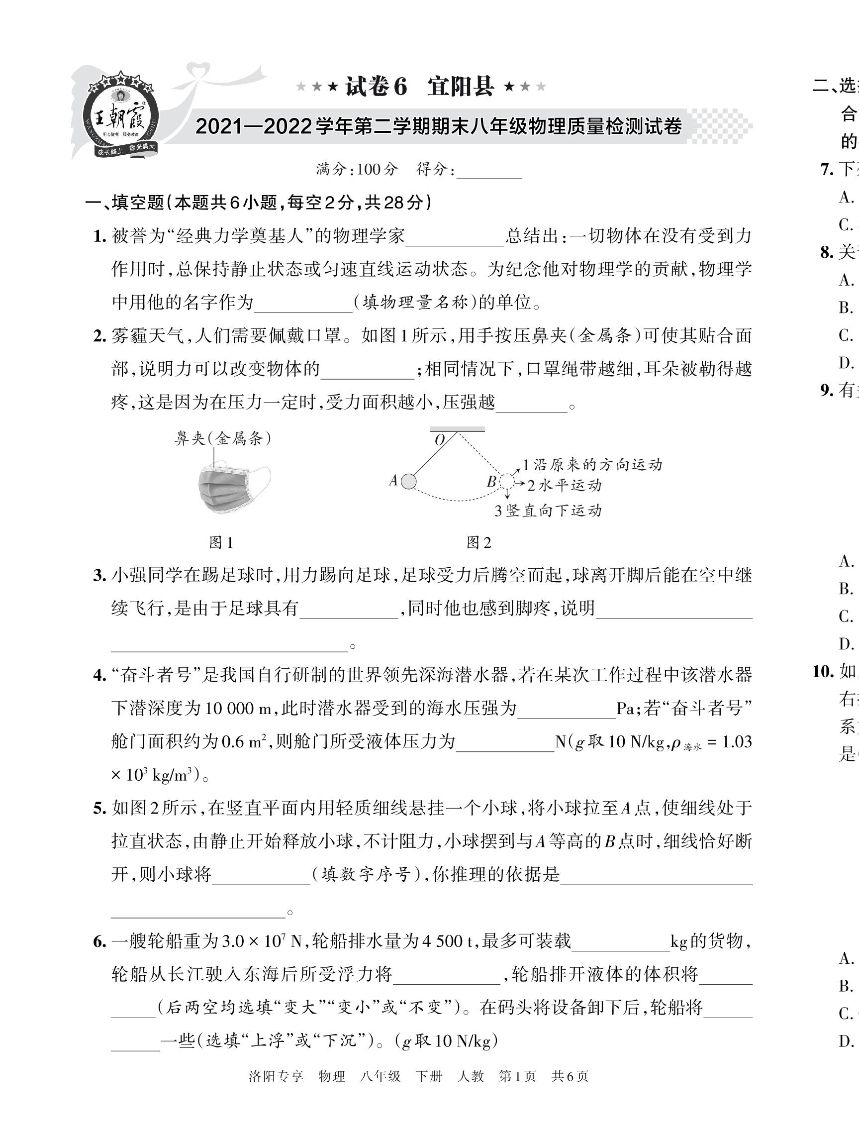宜阳县2021—2022学年第二学期期末八年级物理质量检测试卷(人教版)【6】
