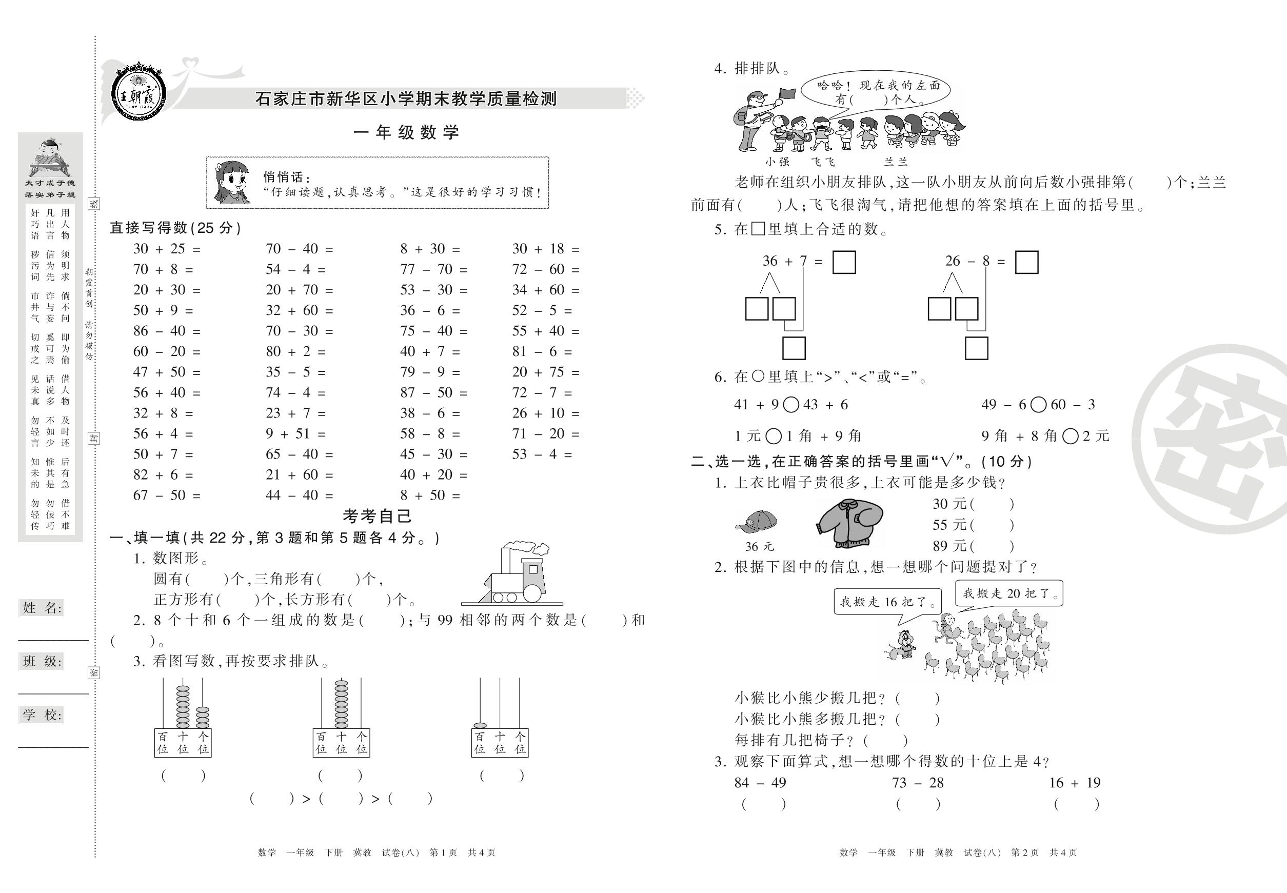 2015-2016学年第二学期石家庄市新华区一年级数学试卷(冀教版)【8】
