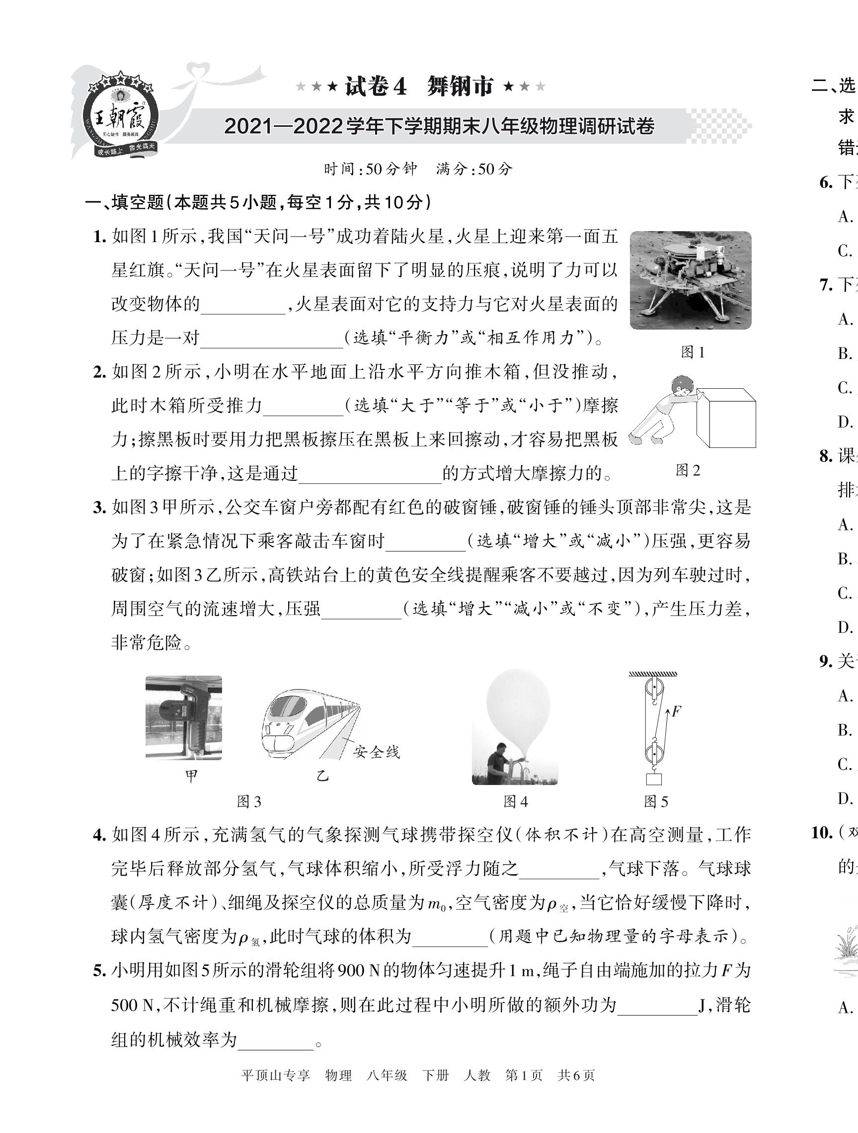 舞钢市2021—2022学年下学期期末八年级物理调研试卷(人教版)【4】