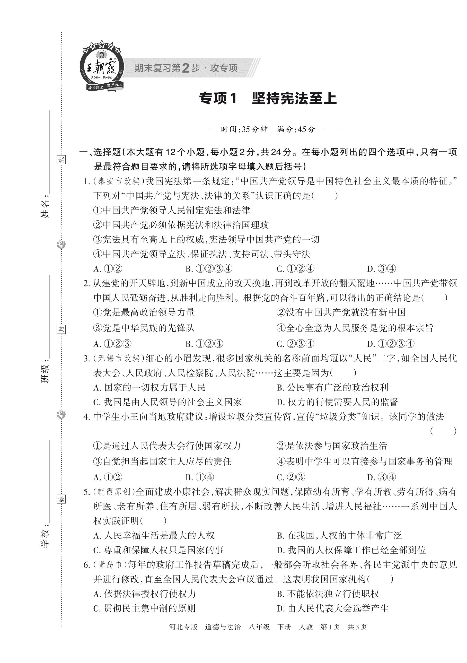 王朝霞期末专项卷——坚持宪法至上八年级下册道德与法治(人教版)_R230504104049340【1】