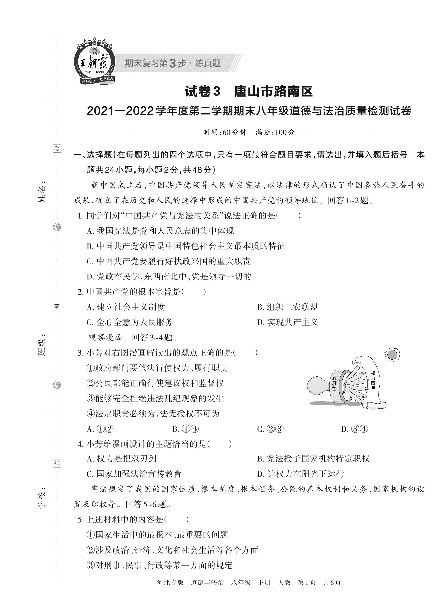 唐山市路南区2021—2022学年度第二学期期末八年级道德与法治质量检测试卷(人教版)【3】