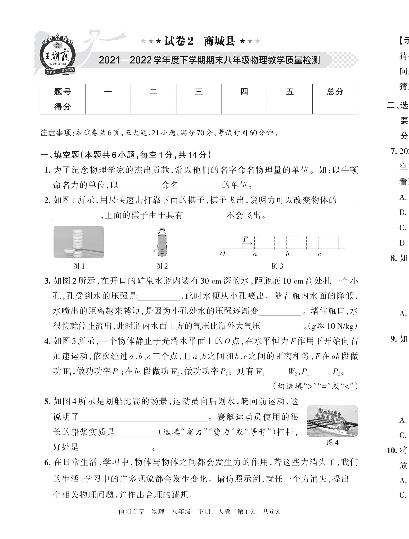 商城县2021—2022学年度下学期期末八年级物理教学质量检测(人教版)【2】