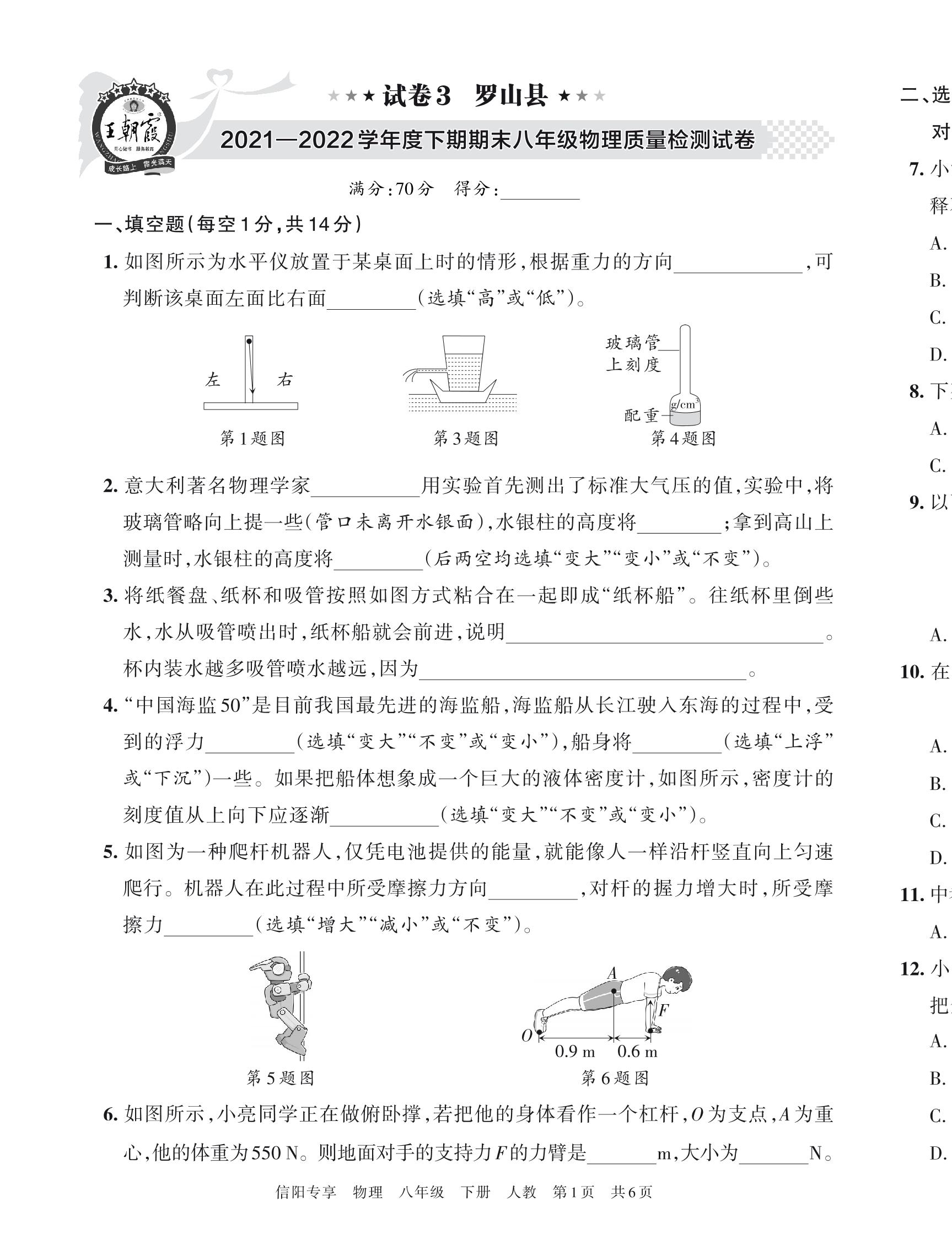 罗山县2021—2022学年度下期期末八年级物理质量检测试卷(人教版)【3】