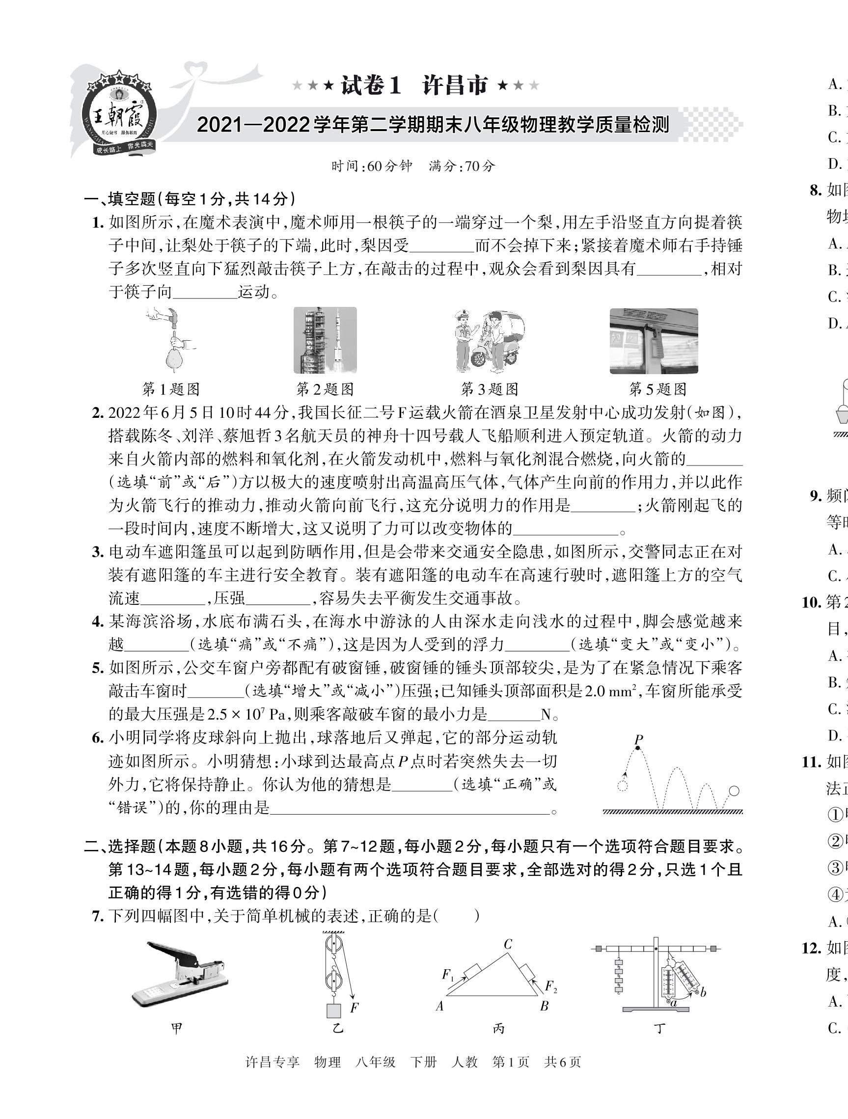 许昌市2021—2022学年第二学期期末八年级物理教学质量检测(人教版)【1】