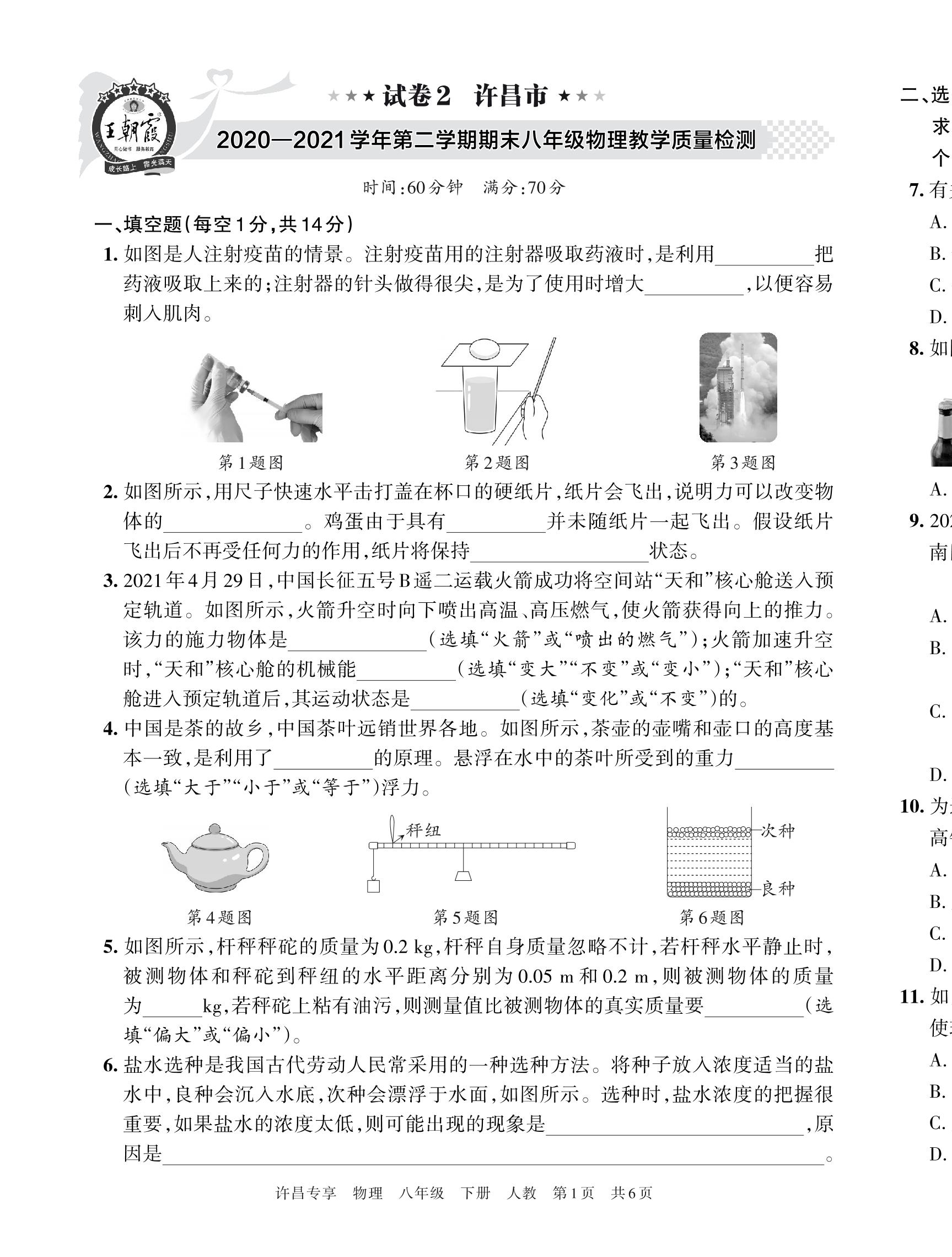 许昌市2020—2021学年第二学期期末八年级物理教学质量检测(人教版)【2】
