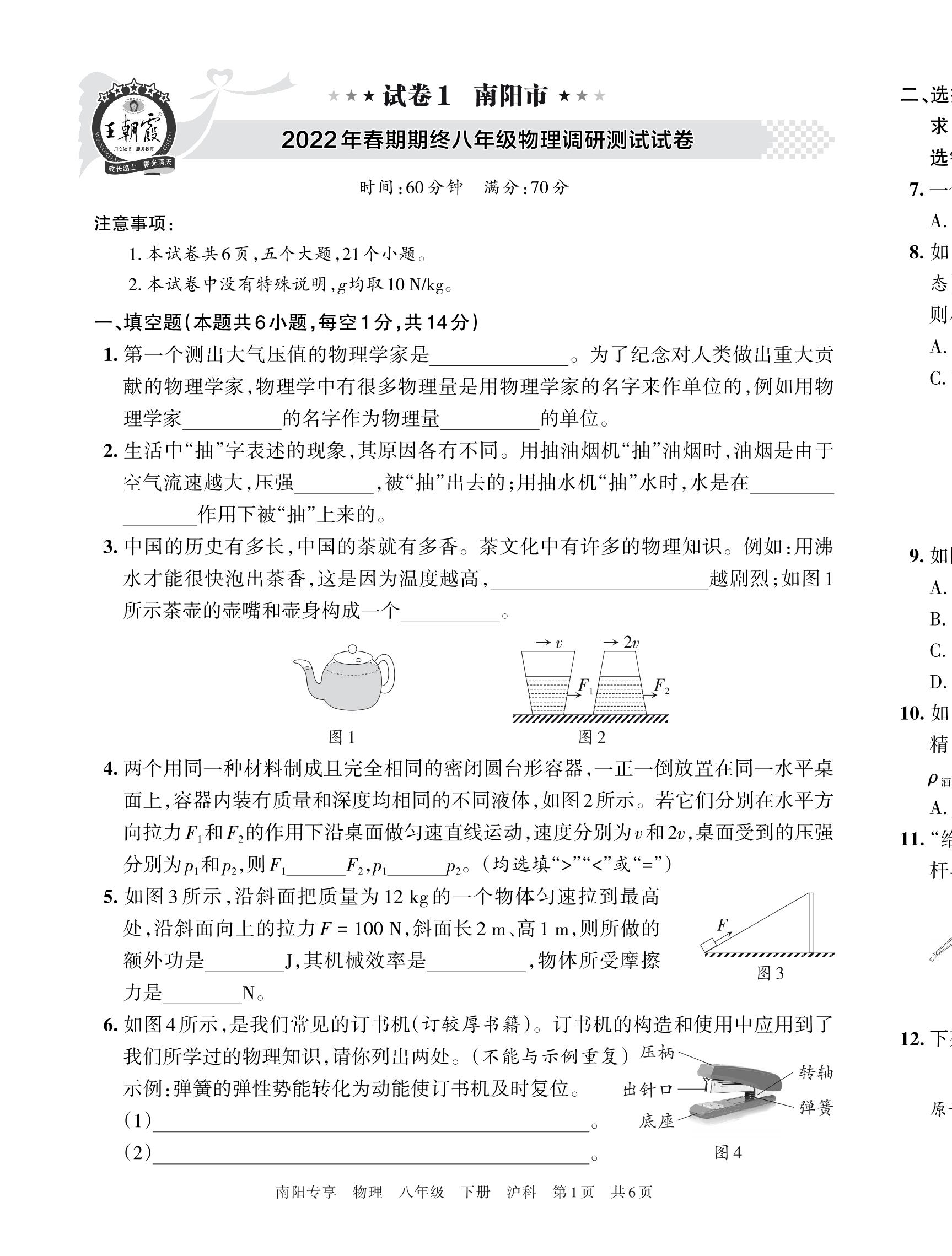 南阳市2022年春期期终八年级物理调研测试试卷(沪科版)【1】