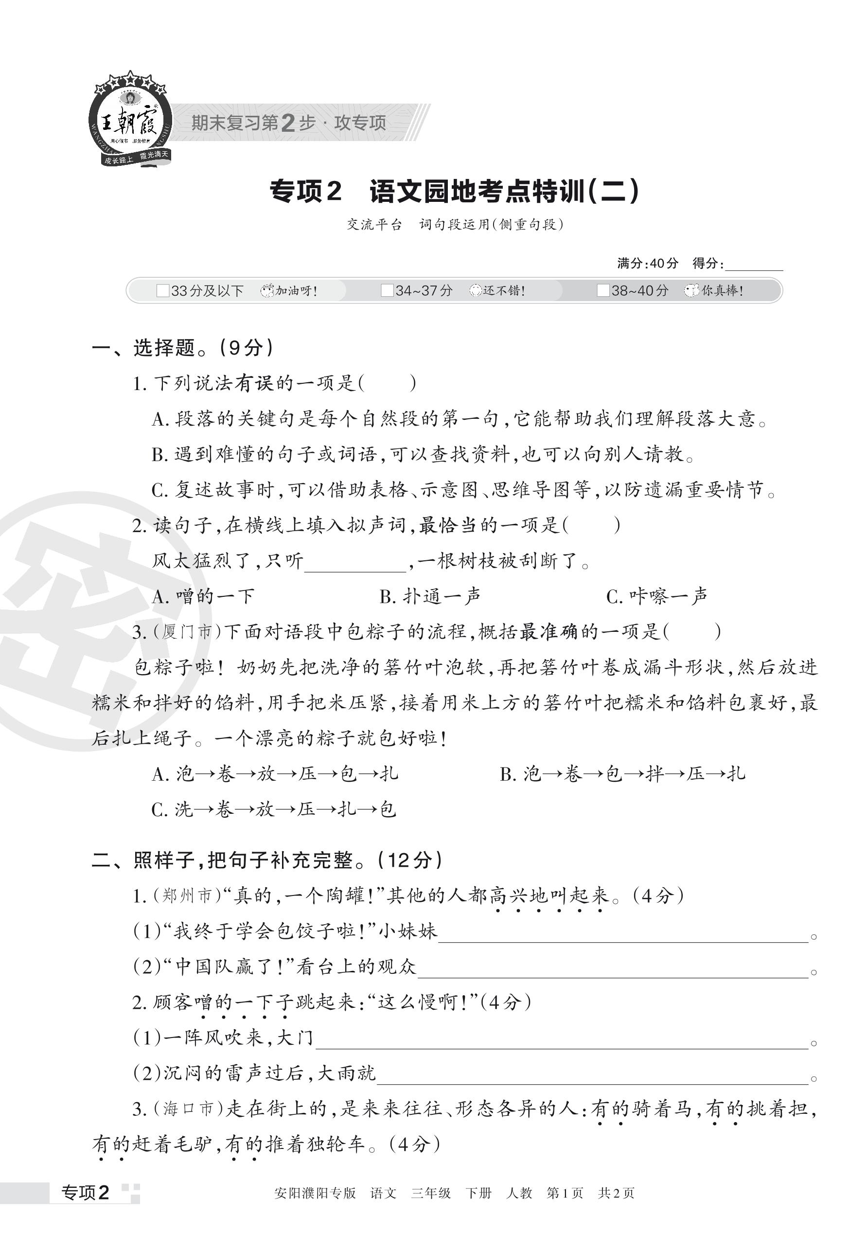 王朝霞期末专项卷——语文园地考点特训(二)三年级下册语文(人教版)_R230504113106174【2】
