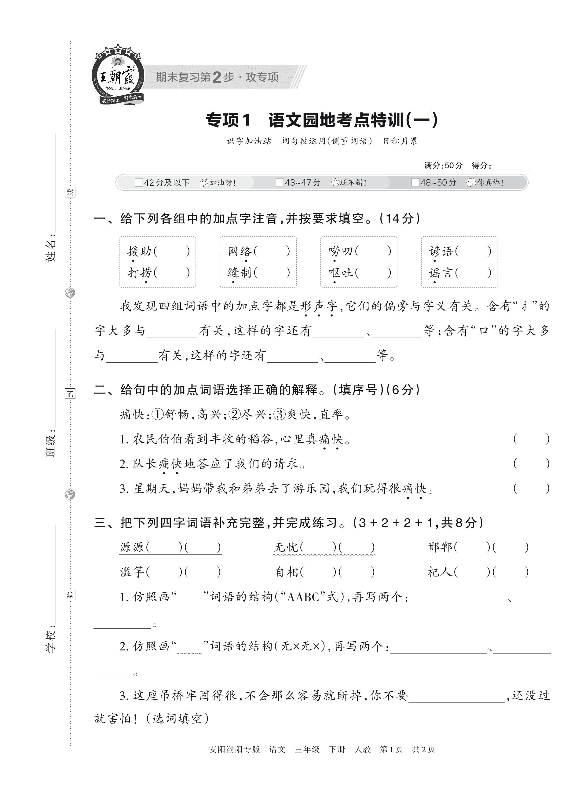 王朝霞期末专项卷——语文园地考点特训(一)三年级下册语文(人教版)_R230504113106176【1】