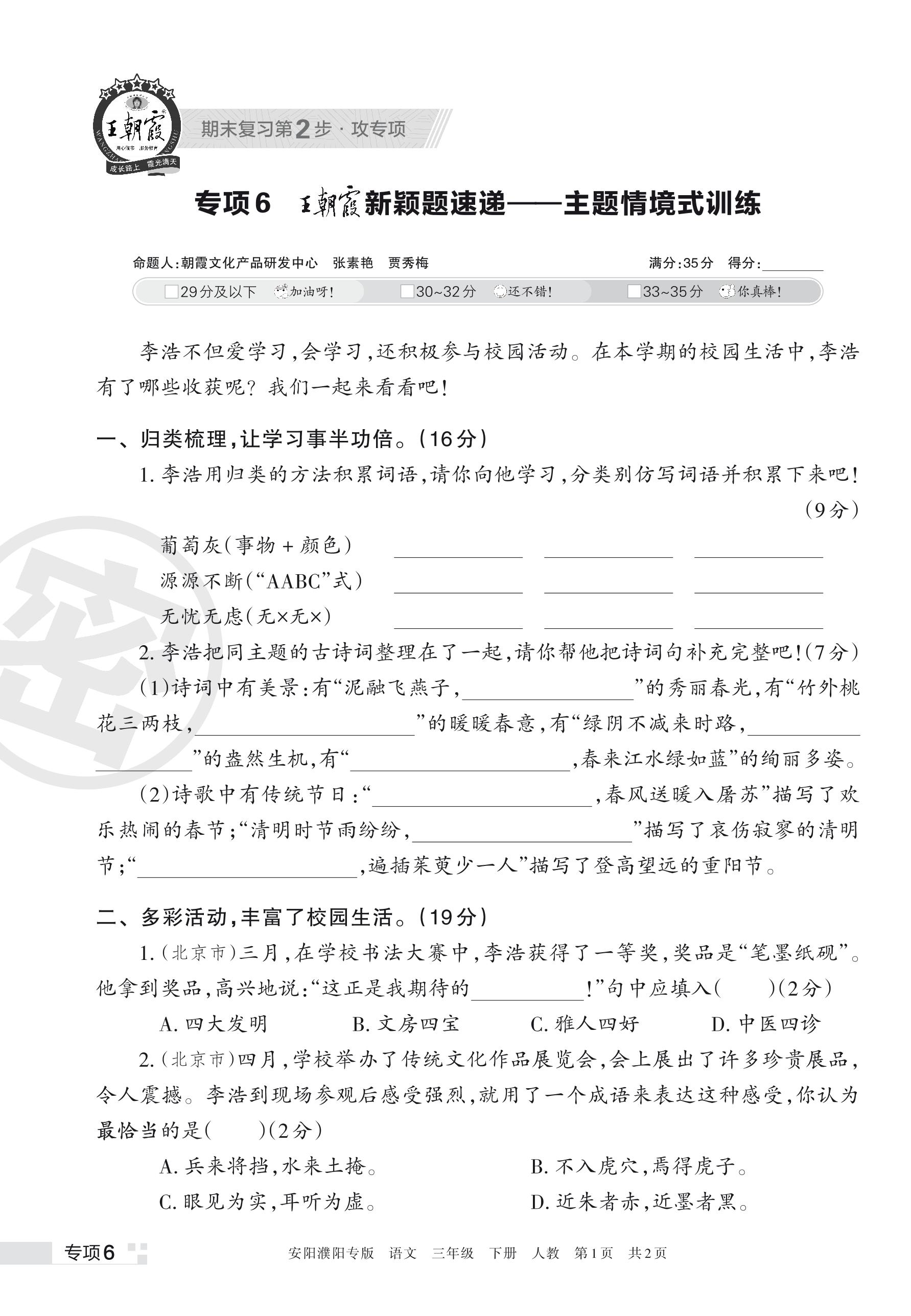 王朝霞期末专项卷——新颖题速递:主题情境式训练三年级下册语文(人教版)_R230504113106451【6】