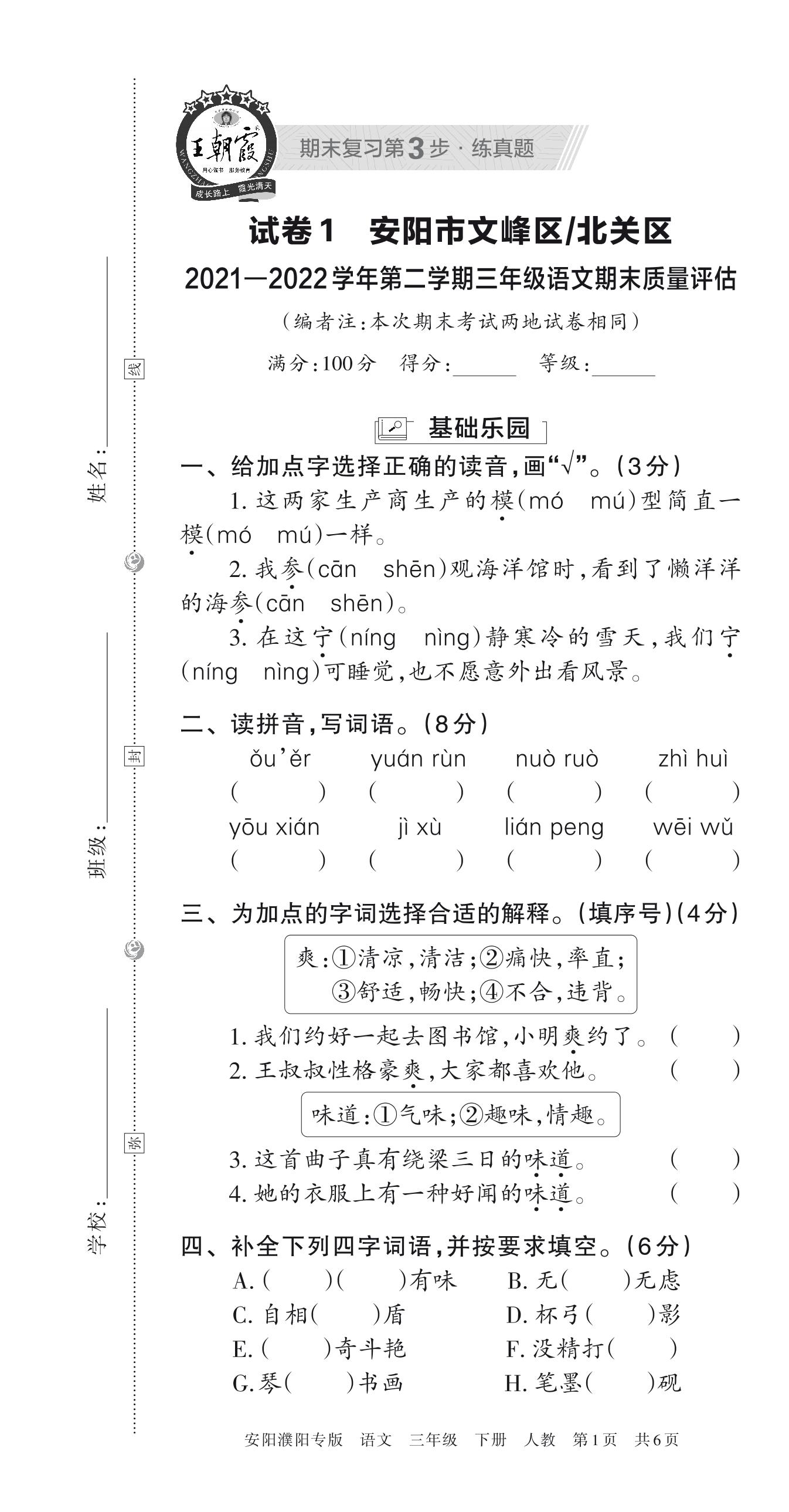 安阳市文峰区、北关区2021—2022学年第二学期三年级语文期末质量评估(人教版)【1】