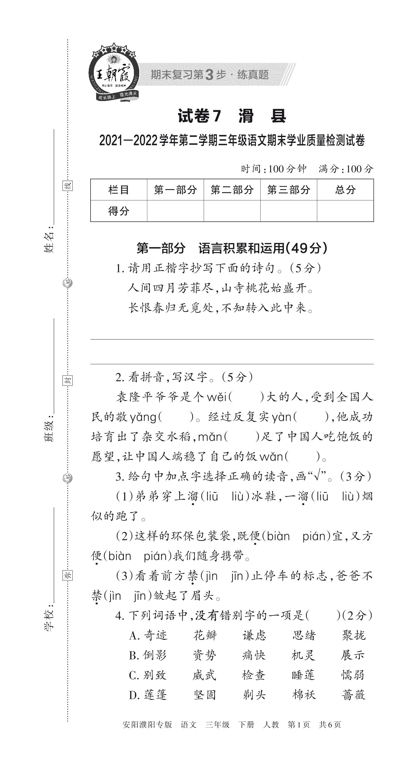 滑县2021—2022学年第二学期三年级语文期末学业质量检测试卷(人教版)【7】