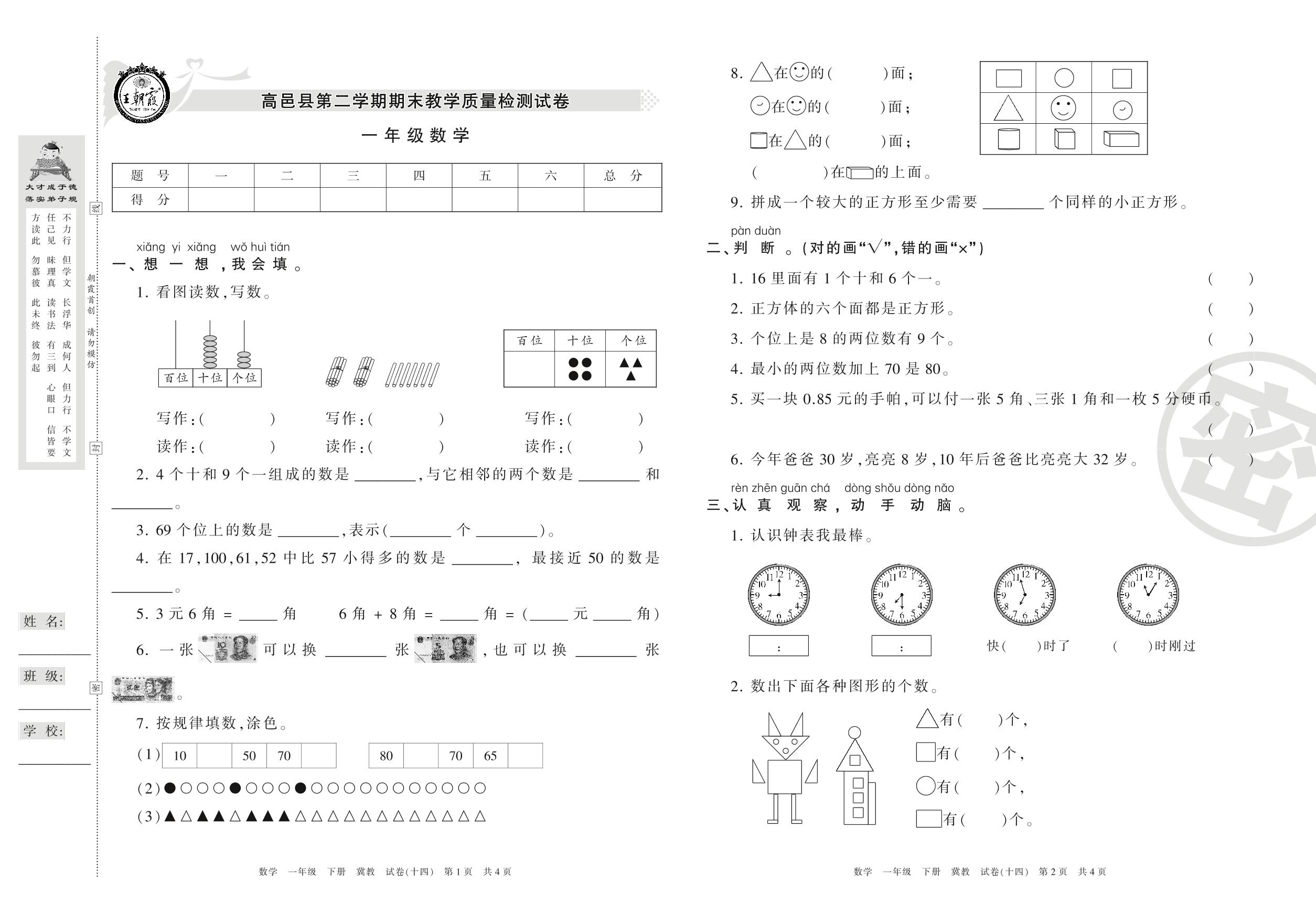 一年级数学冀教版下册期末卷