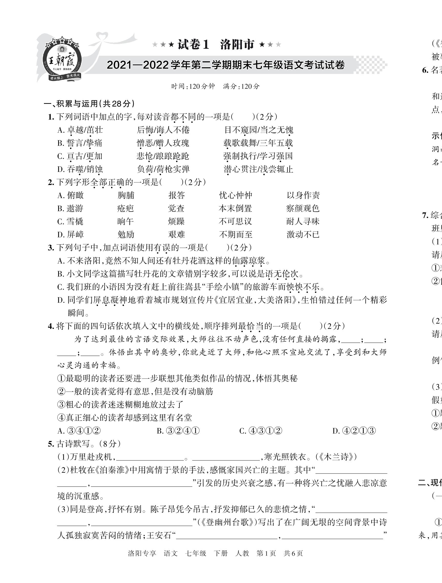 洛阳市2021—2022学年第二学期期末七年级语文考试试卷(人教版)【1】