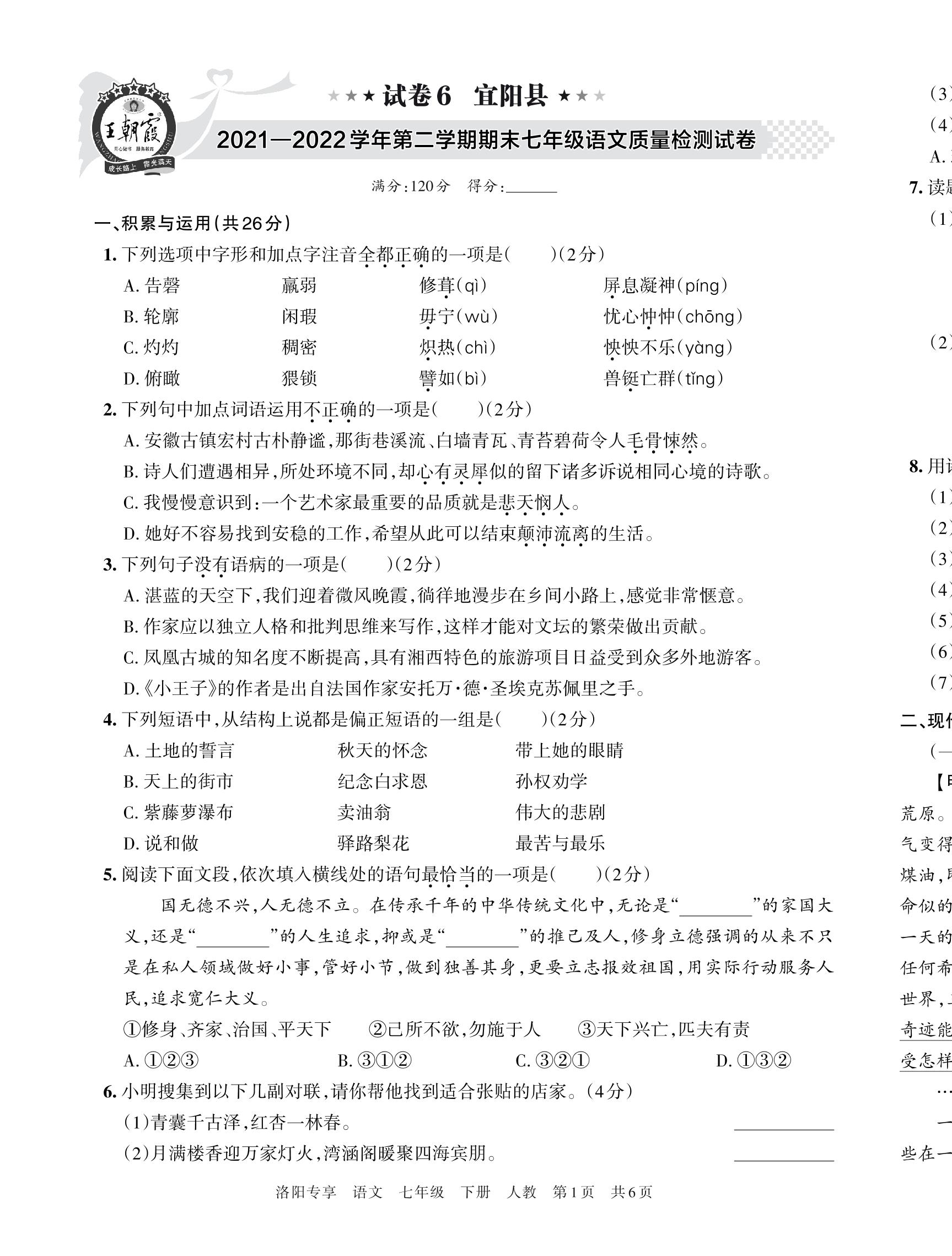 宜阳县2021—2022学年第二学期期末七年级语文质量检测试卷(人教版)【6】
