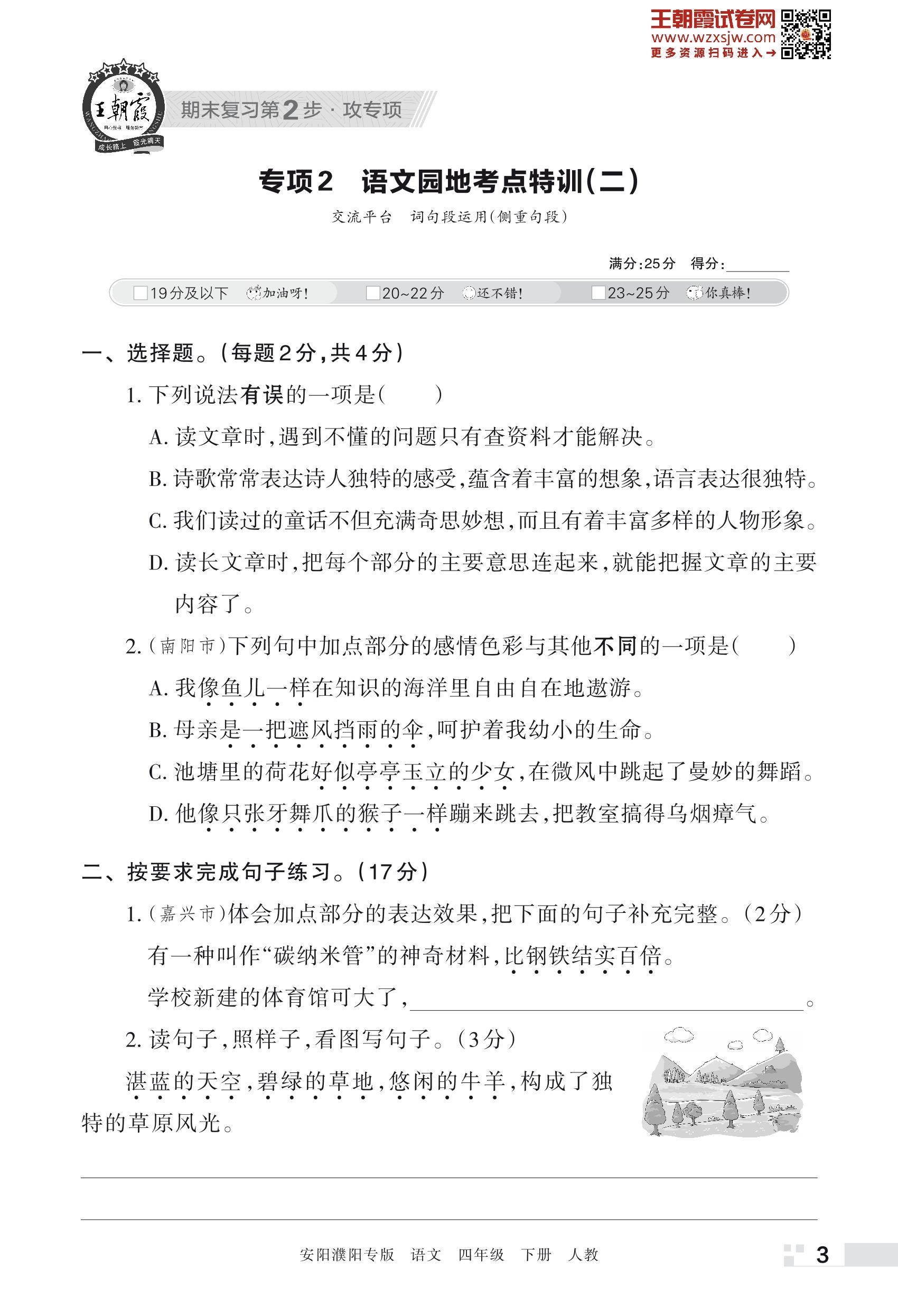 王朝霞期末专项卷——语文园地考点特训(二)四年级下册语文(人教版)_R230504133904400【2】