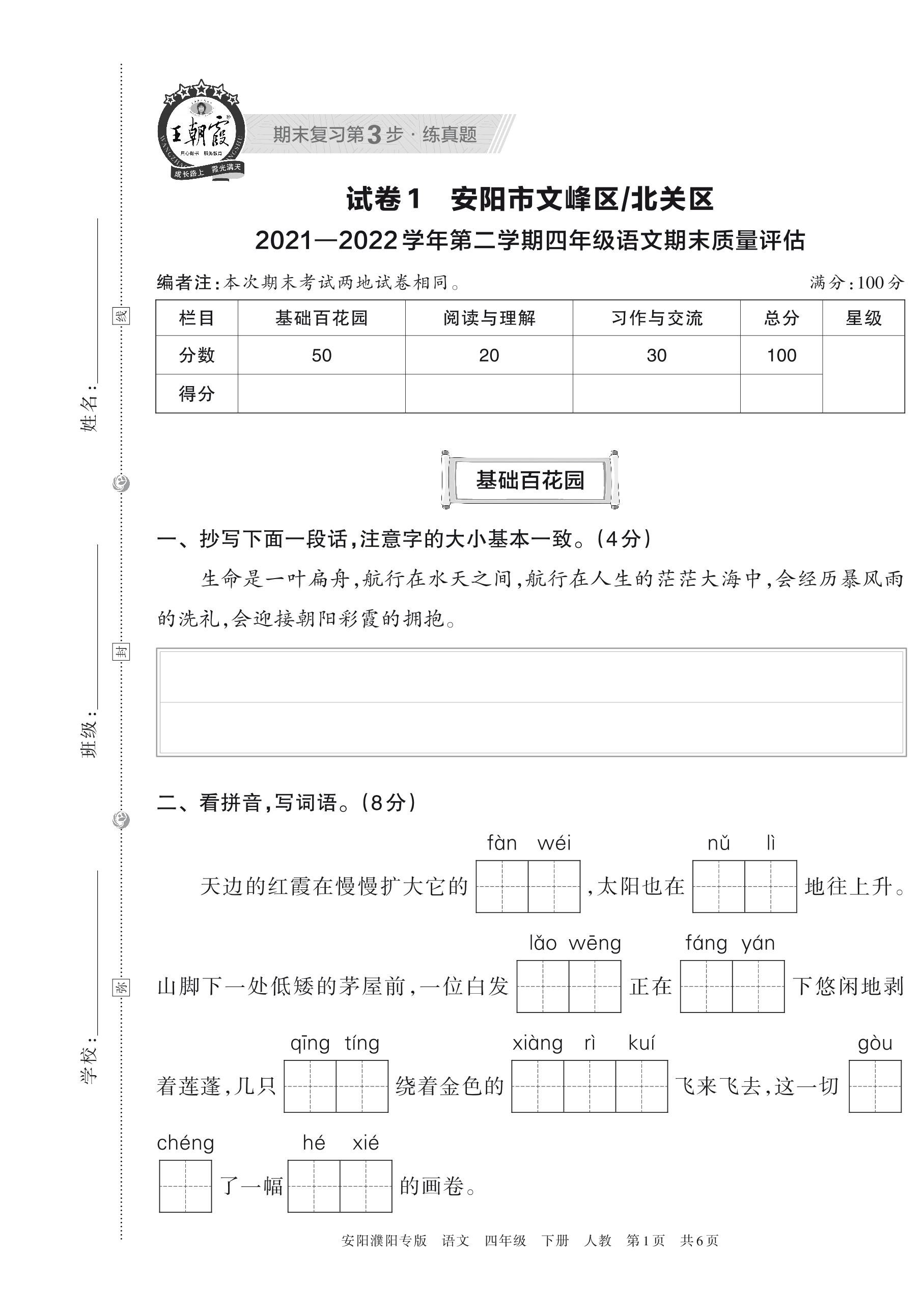 安阳市文峰区、北关区2021—2022学年第二学期四年级语文期末质量评估(人教版)【1】