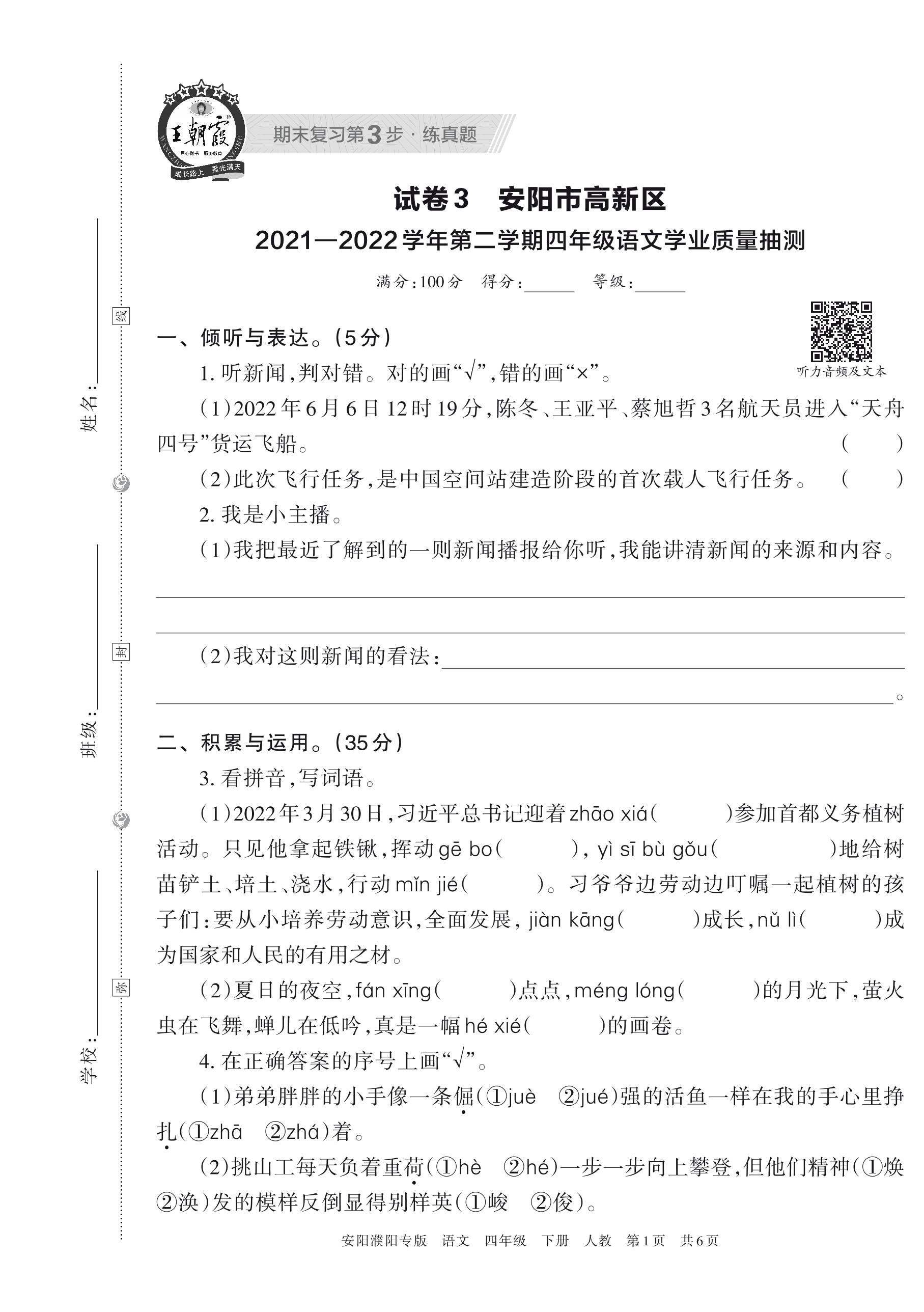 安阳市高新区2021—2022学年第二学期四年级语文学业质量抽测(人教版)【3】