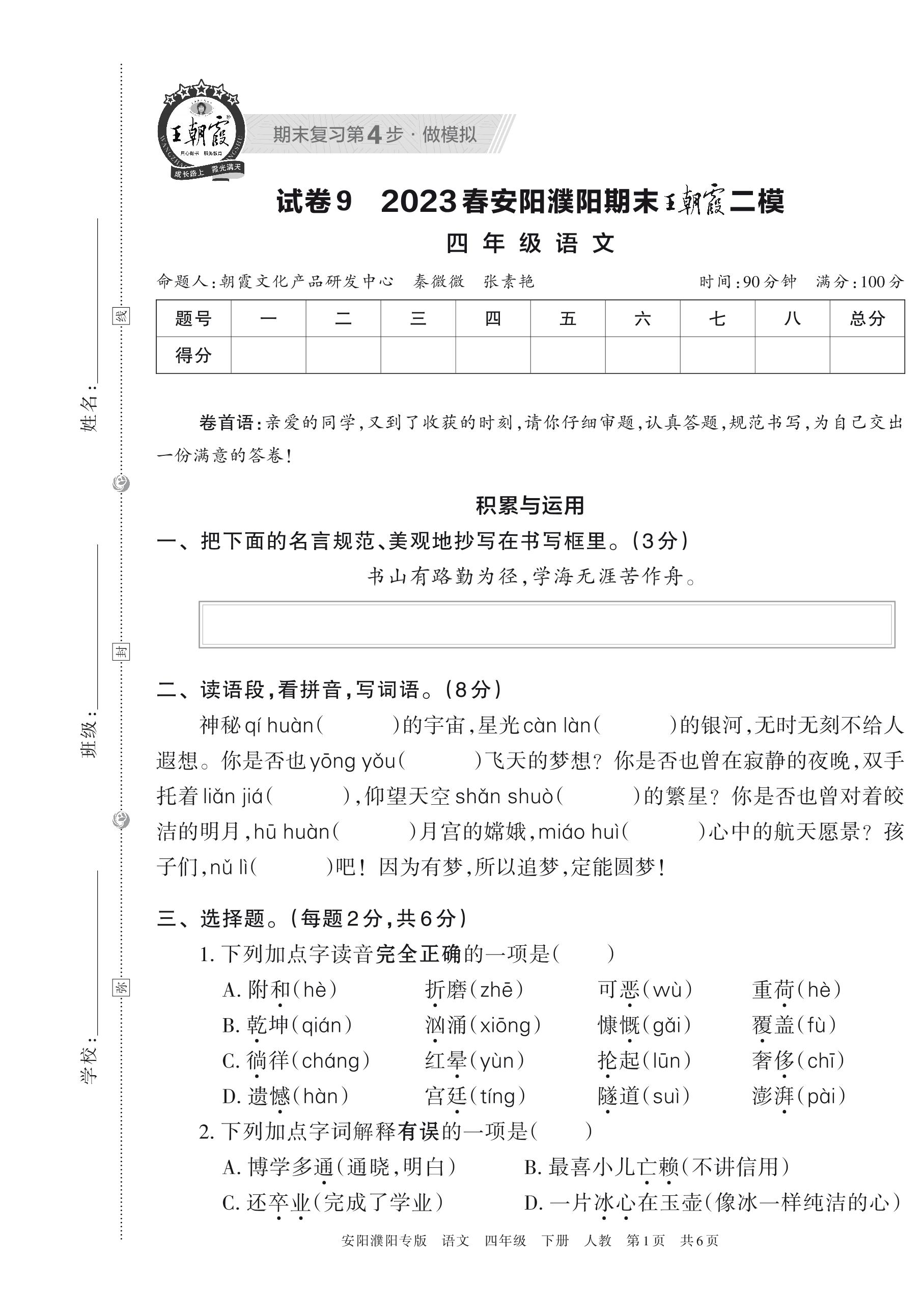 王朝霞期末模拟卷四年级下册语文(人教版)_R230504133906515【9】