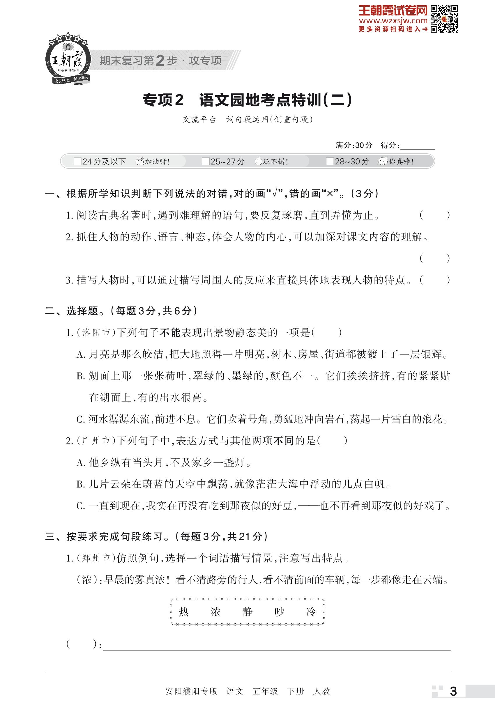 王朝霞期末专项卷——语文园地考点特训(二)五年级下册语文(人教版)_R230504134556454【2】