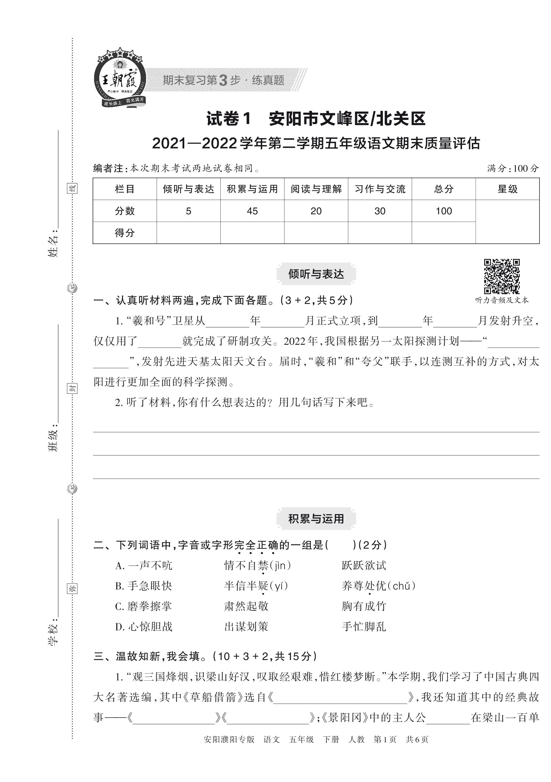 安阳市文峰区、北关区2021—2022学年第二学期五年级语文期末质量评估(人教版)【1】