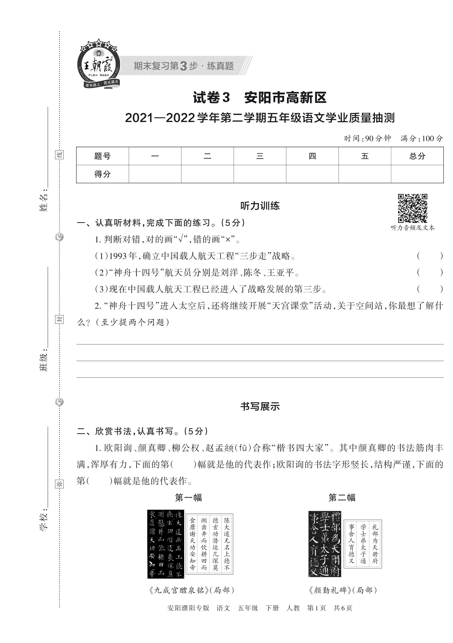 安阳市高新区2021—2022学年第二学期五年级语文学业质量抽测(人教版)【3】