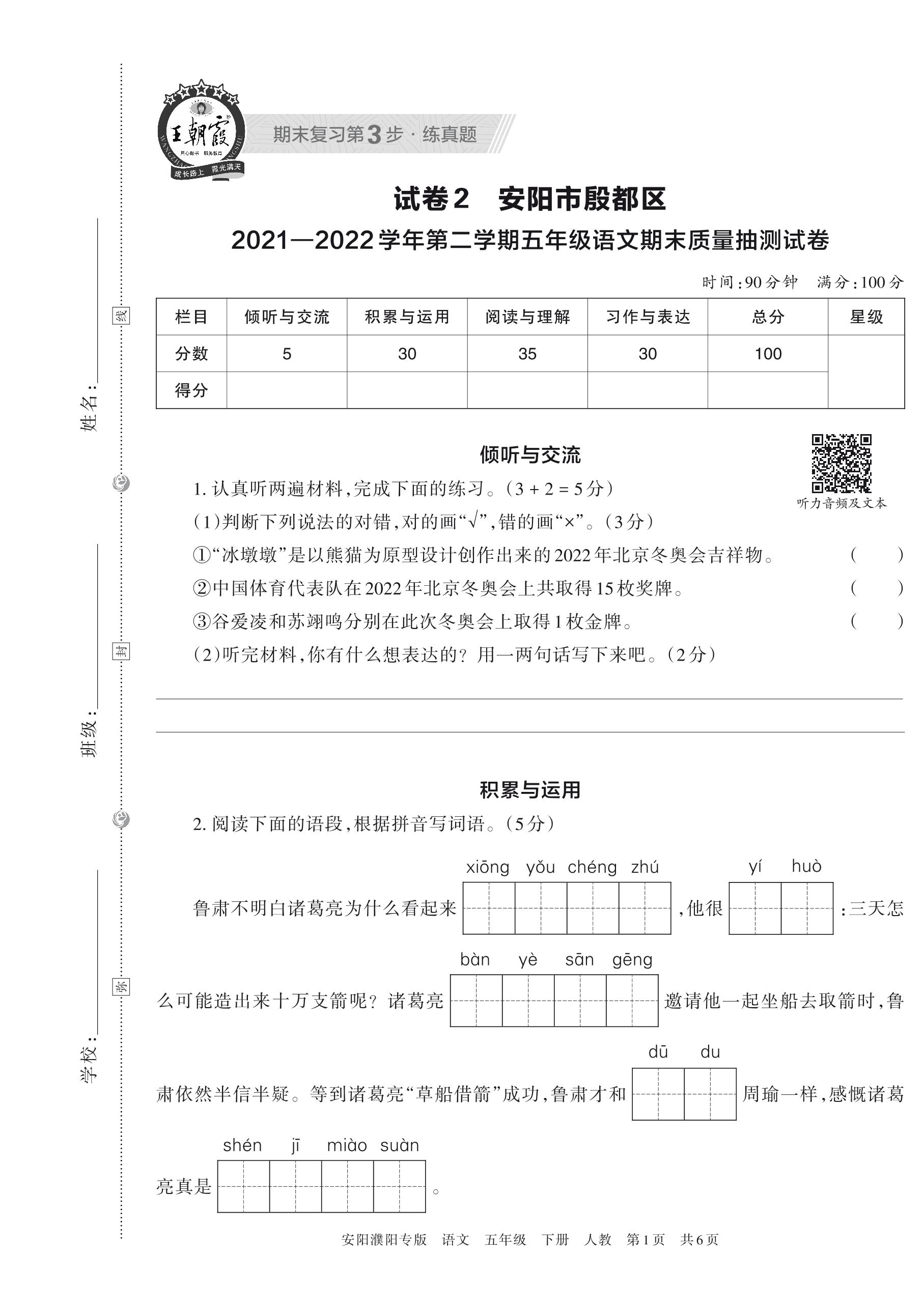 安阳市殷都区2021—2022学年第二学期五年级语文期末质量抽测试卷(人教版)【2】