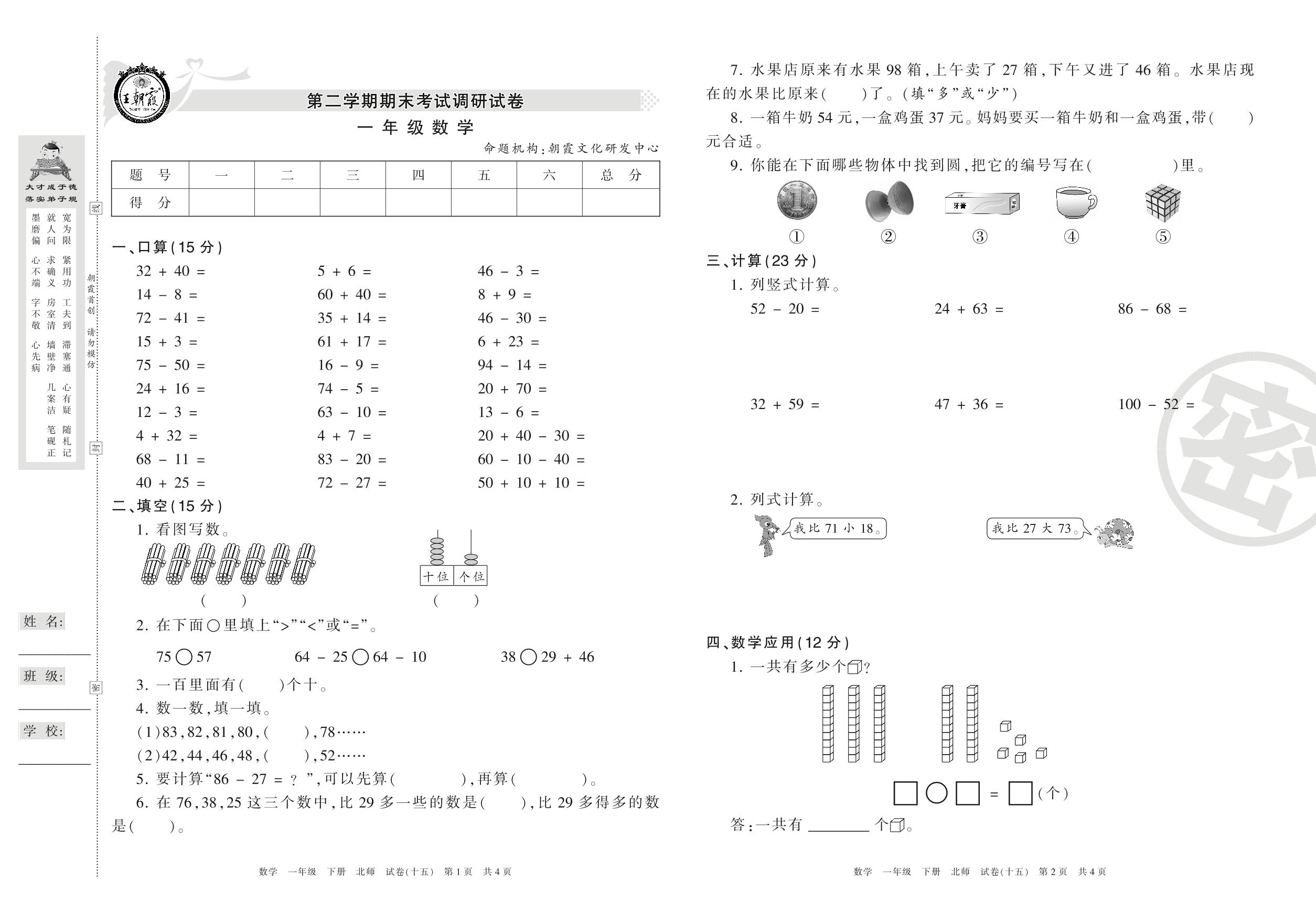 王朝霞期末调研卷一年级下册数学(北师版)【15】