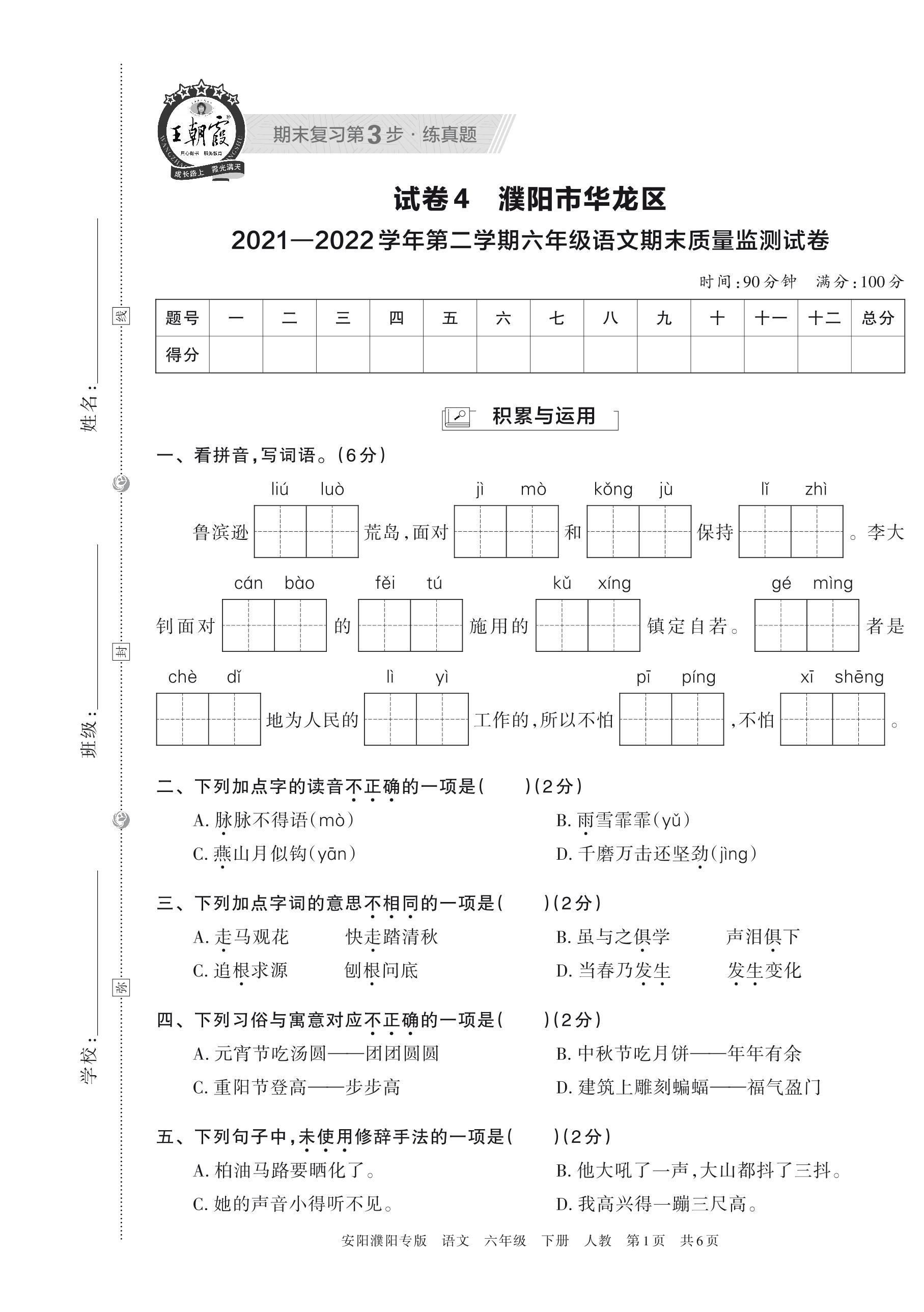 濮阳市华龙区2021—2022学年第二学期六年级语文期末质量监测试卷(人教版)【4】