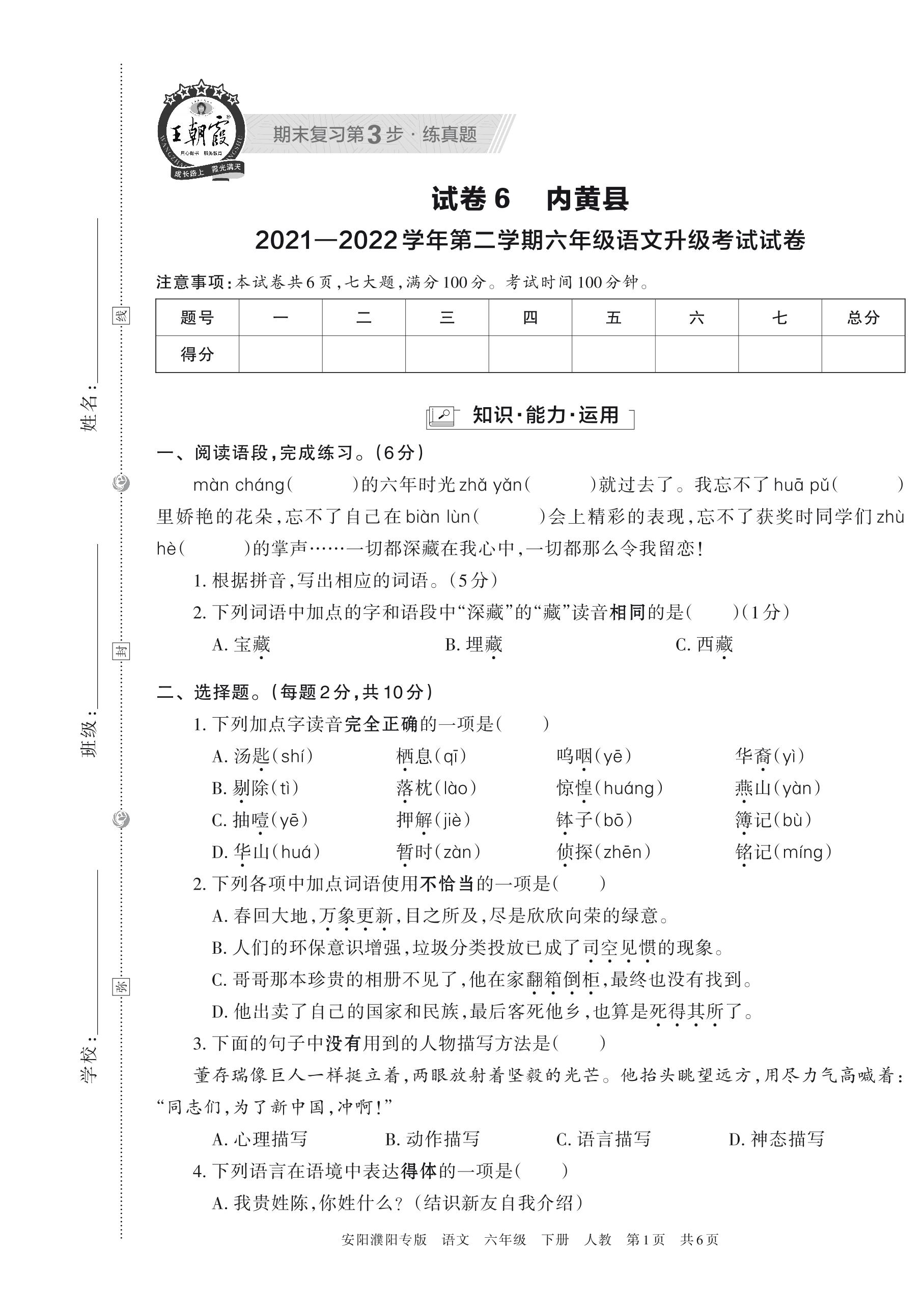 内黄县2021—2022学年第二学期六年级语文升级考试试卷(人教版)【6】